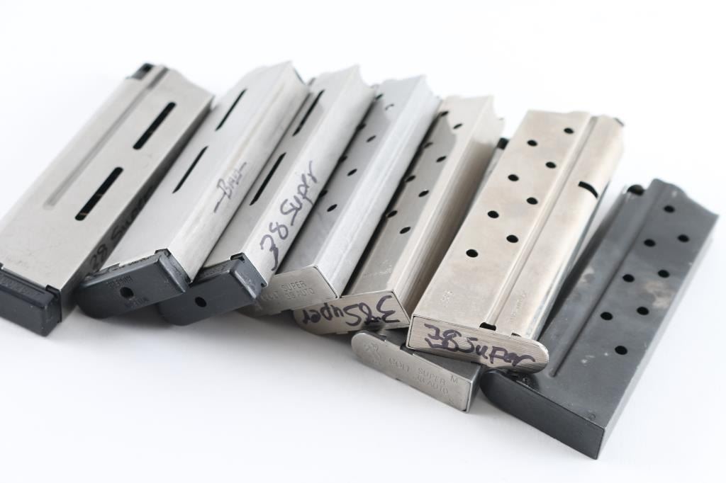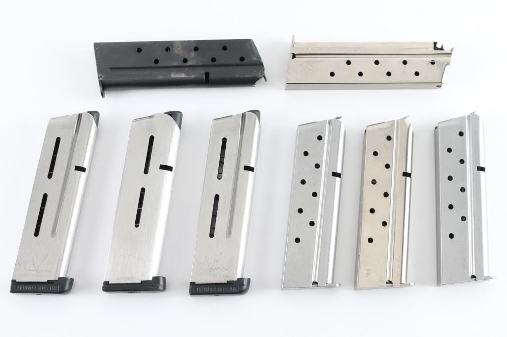 Lot of 8 magazines: 1) 3 - stainless Wilson Combat w/ plastic butt plates; 2) 3 - Colt magazines, 2 stainless and 1 blue metal; 3) 2 - stainless Meggar magazines. Blued magazines showing little rust and minor pitting. Rest are in excellent condition.