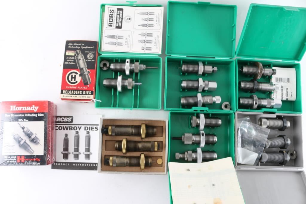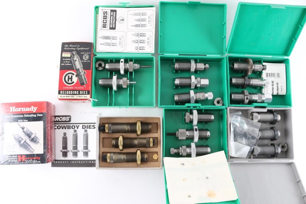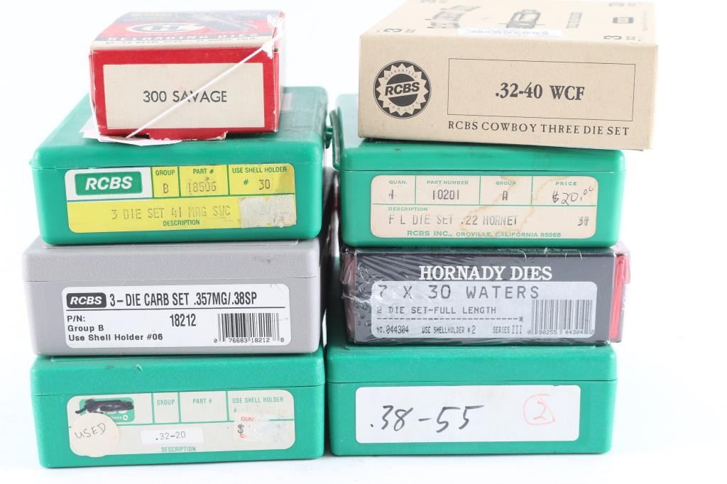 Includes RCBS dies for: .22 Hornet, .32-20, .32-40, .357 MAG/ .38 SPL, .41 MAG; C-H Precision die for .300 Savage; Lee die for .38-55 and Hornady die for 7-30 Waters. All very good condition in factory cases/boxes.