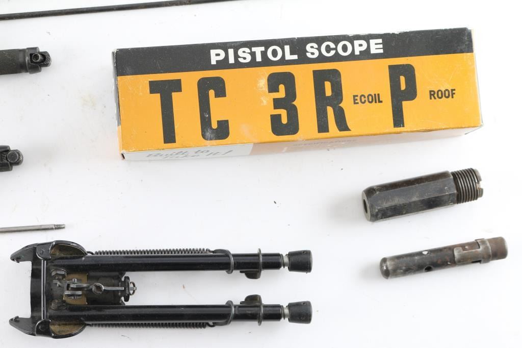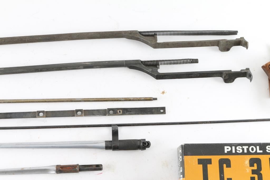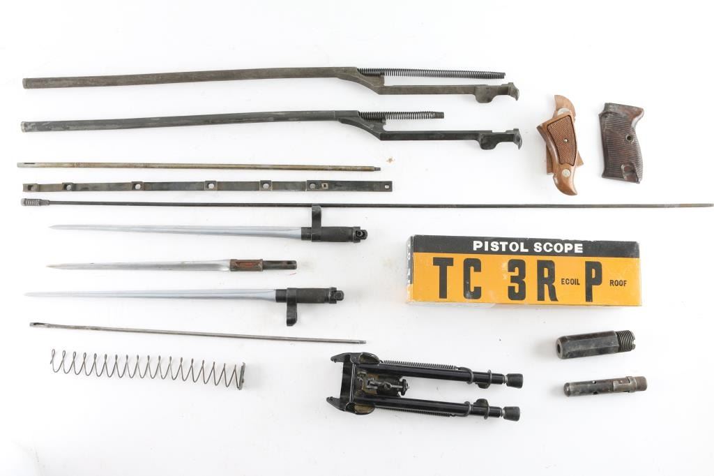 includes several spike bayonets (Chinese SKS), 2 M1 Garand Op Rods (fair to good), Thompson Center Scope, handgun grips, rifle cleaning rods, more.