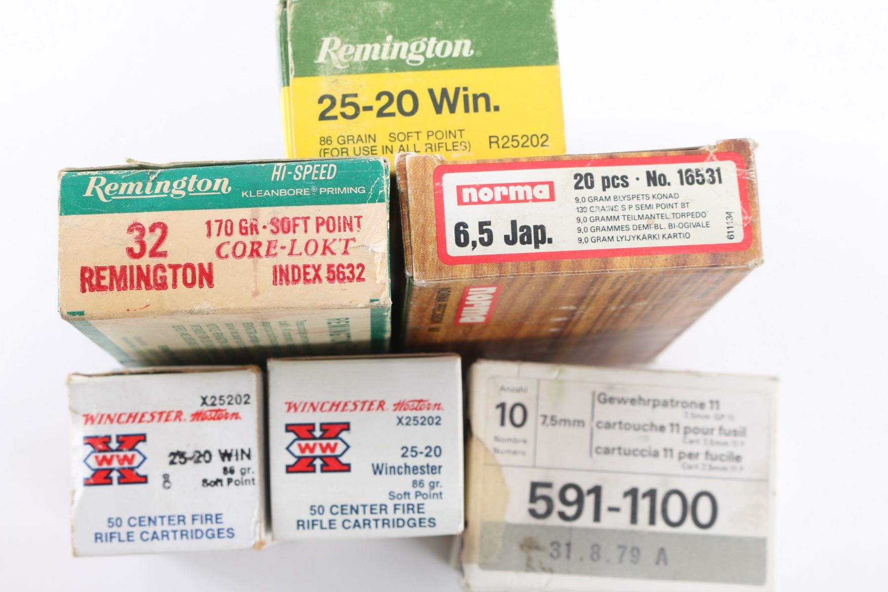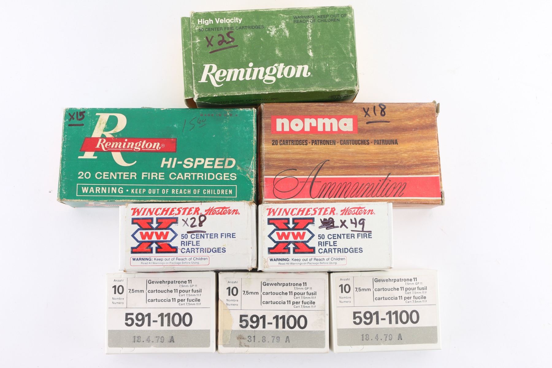 30 rds 7.5 Swiss GP11, partial boxes of 25-20 (approx 100 rds total), 6.5mm Arisaka (18 rds), 32 Remington (15 rds).