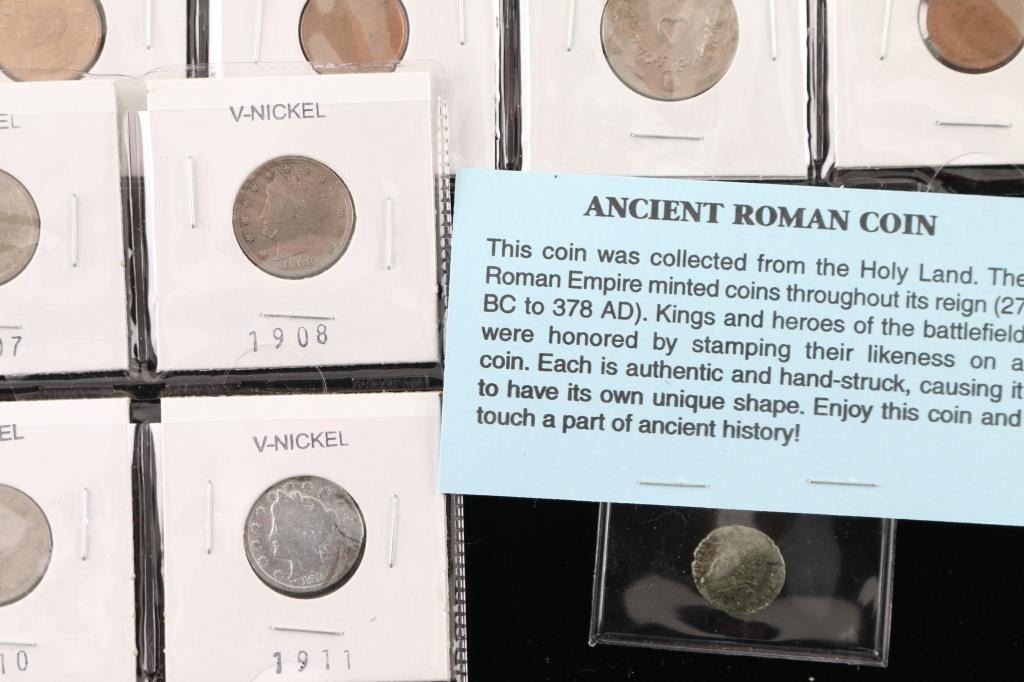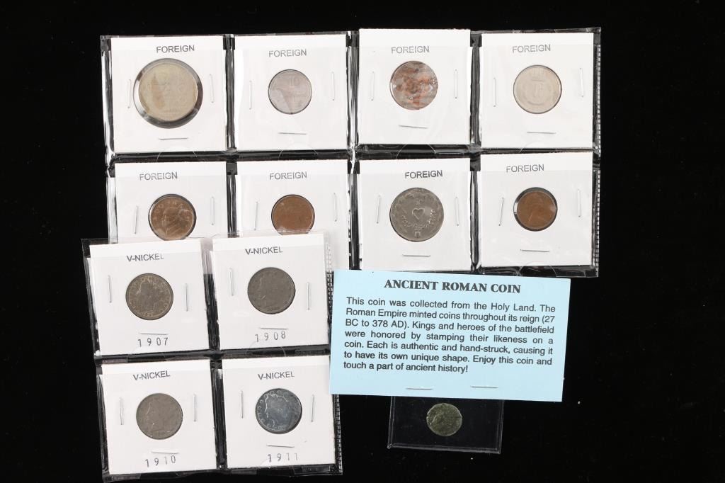 Includes a ancient Roman coin, 4 Victorian Nickels in various conditions also included is a mix of foreign coins for a total of 8 coins from various countries in various conditions.