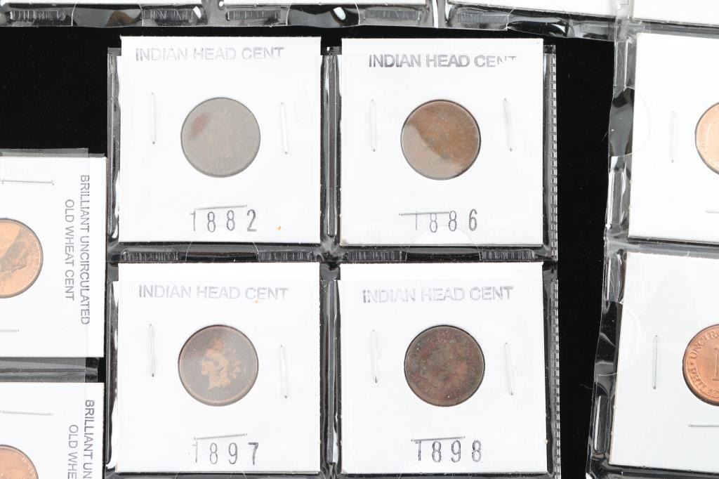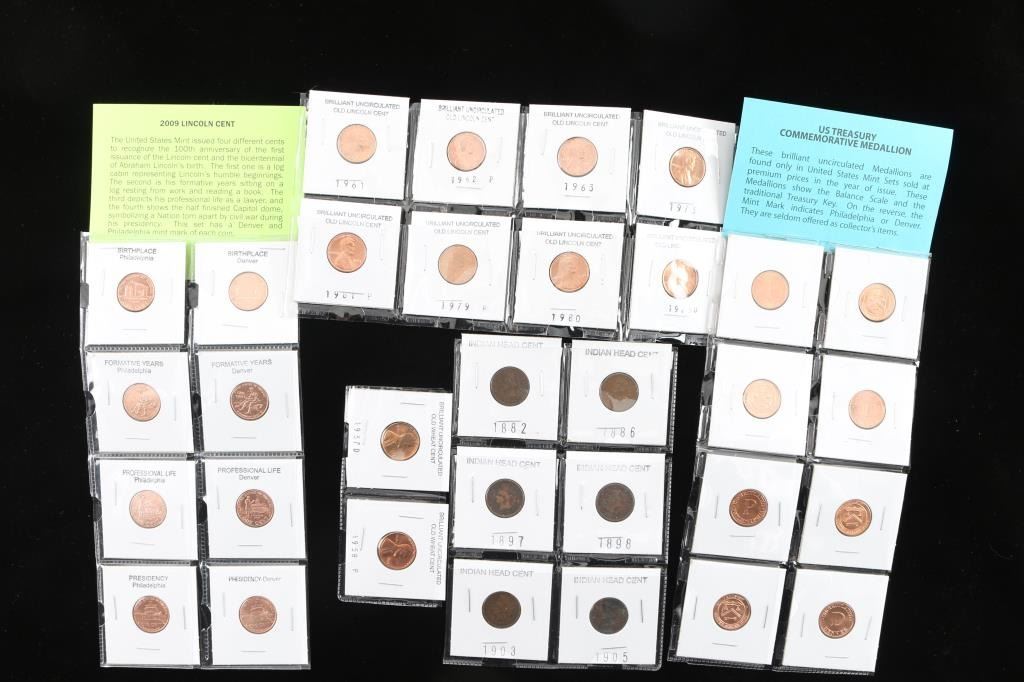 Includes 10 uncirculated "Old Lincoln 1 cents pennies" from 1957-1981, all in various conditions, in plastic protectors. 6 indian head cents from 1882-1905 not all coins in lot are consecutive. The indian head coins are in various condtions , kept in plastic protector. Also included is 8 Uncirculated U.S Treasury Commemorative Medallion pennies , kept in protectors in good condition. included with this lot is a 2009 Lincoln 1 cent mint set in plastic protectors in good condition.