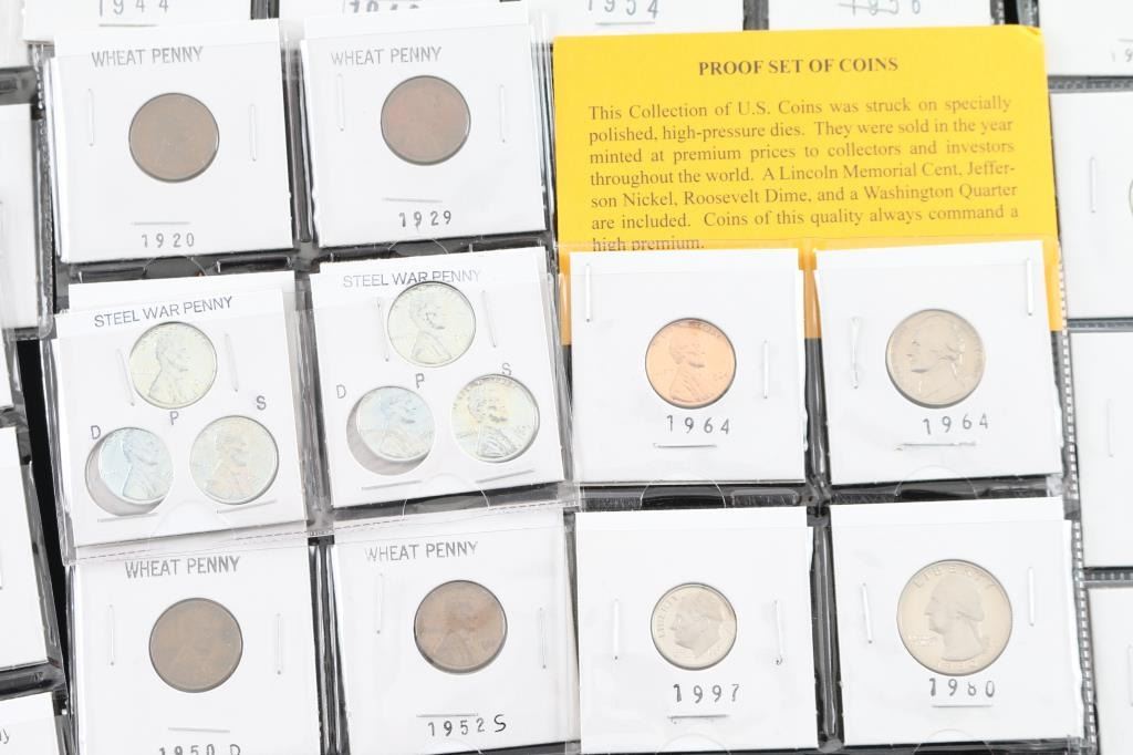 Includes 12 steel war pennies, 8 uncirculated roosevelt dimes, Proof set of U.S coins, an 20 wheat pennies.