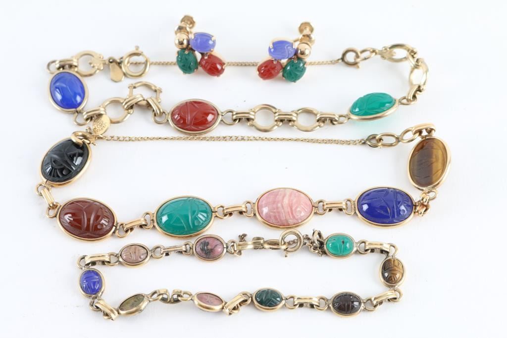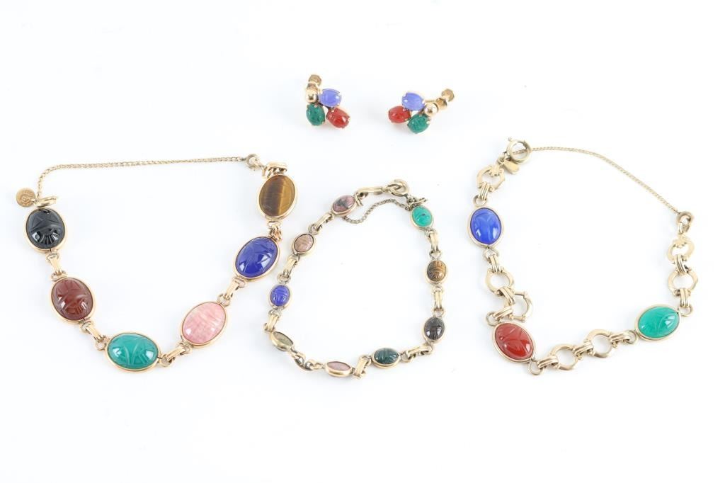 3 scarab bracelets with colorful stones and one matching set of screw back earrings. 12K GF metals