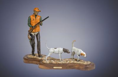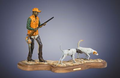 This bronze sculpture features a bird hunter with an English pointer and English setter on point, at 1/4 life size, with a full color patina.