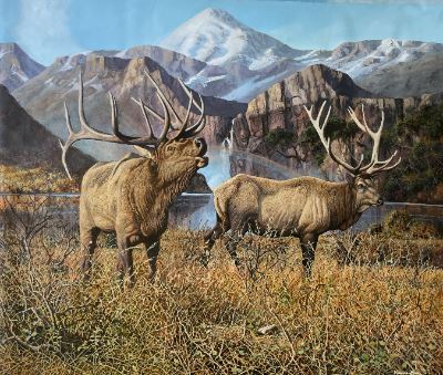 This stunning painting by Maxine captures the beauty and majesty of two magnificent elk in the Colorado mountains.