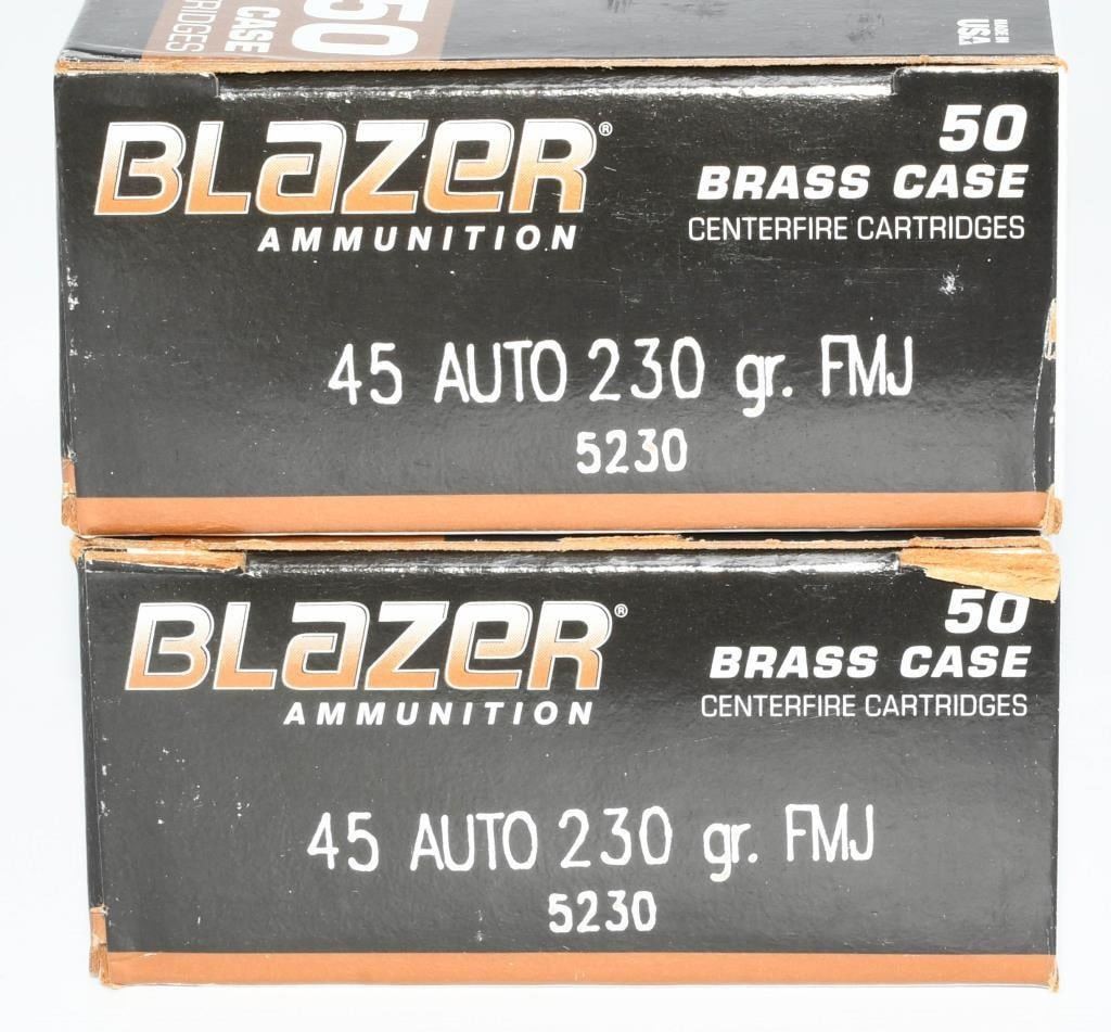 Secure your ammunition needs with a hundred rounds of Blazer .45 ACP, featuring 230-grain full metal jacket bullets. This brass-cased ammunition ensures reliable performance and consistent cycling, making it a preferred choice for both professional shooters and responsible gun owners alike. Crafted with precision, each round is designed to deliver accuracy and stopping power. The full metal jacket construction provides smooth feeding and minimizes fouling, ensuring a reliable shooting experience. The 230-grain weight is well-suited for various applications, making this ammunition a versatile choice for your .45 ACP firearms. Blazer is recognized for its commitment to quality, and this ammunition is no exception. Whether you're honing your skills at the range or preparing for self-defense scenarios, these 100 rounds of Blazer .45 ACP ammunition offer the reliability and performance you can depend on. Bid with confidence to elevate your shooting experience with this high-quality brass-cased ammo. Note: Please ensure compliance with local and state regulations regarding the purchase and possession of ammunition.