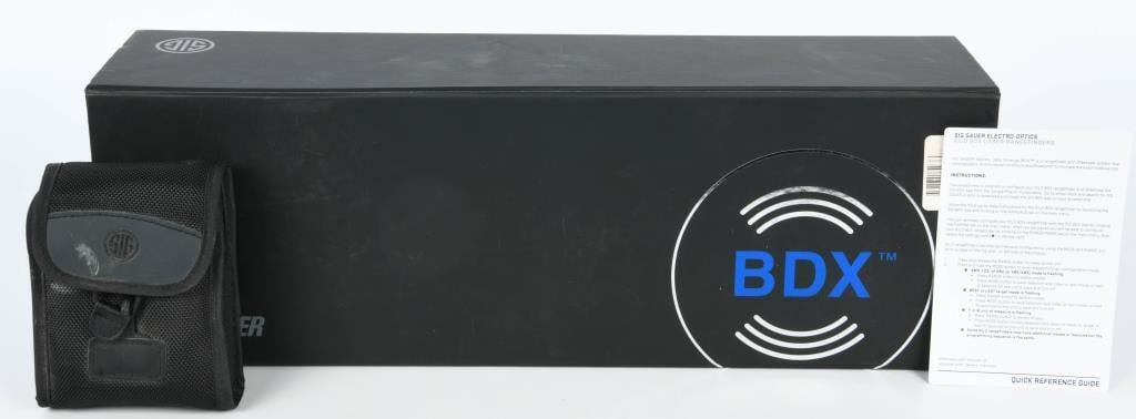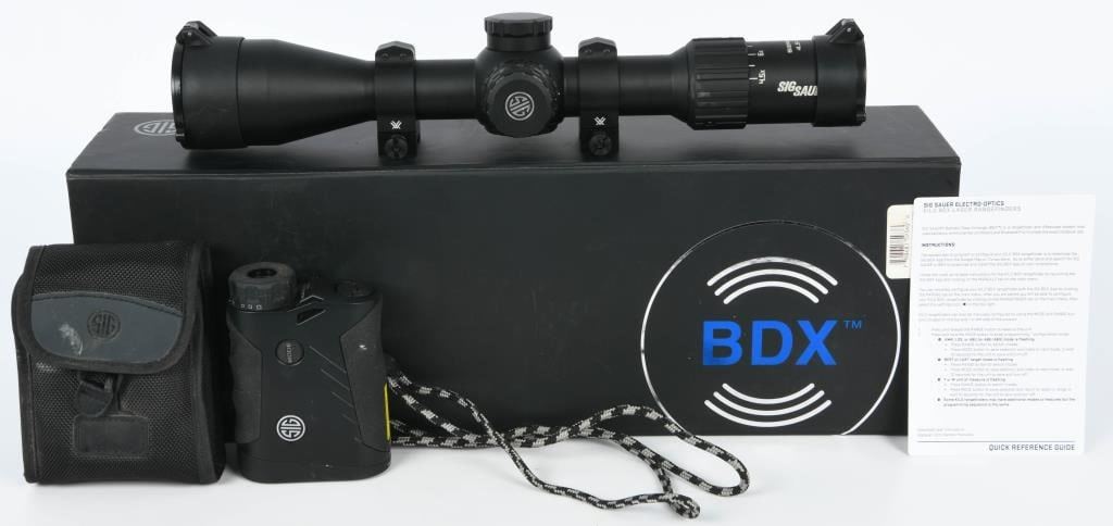 Sig Sauer Sierra3BDX Ballistic Xchange Riflescope, Appears in Excellent Condition & Comes With Original Box And Vortex Scope Rings, 30mm Tube 4.5-14x 44mm Side Focus BDX-R1 Digital Ballistic Reticle with KILO1800BDX Laser Rangefinder Disguised within the form factor of a traditional riflescope lies the power of the Sig Sauer BDX Ballistic Data Xchange. The SIERRA3BDX riflescope provides the hunter an illuminated auto-holdover dot on targets when coupled with the included KILO1800BDX rangefinder. Featuring exceptional SpectraCoat lenses, LevelPlex digital anti-cant, and KinETHIC kinetic energy transfer indicator, the SIERRA3BDX is incredibly simple to use. Range a target, put the holdover dot on target, pull the trigger, impact. Sig Sauer's BDX, just CONNECT THE DOT! KILO1800BDX Rangefinder Features Ballistic Data Xchange (BDX) capable, providing your BDX riflescope with an automatic illuminated holdover dot through Bluetooth pairing SpectraCoat anti-reflection coatings for superior light transmission and optical clarity LightWave DSP technology for the fastest and longest distance rangefinder engine HyperScan technology provides 4 range updates per second in scan mode while RangeLock reports the last range result when ranging distant targets Embedded Applied Ballistics Ultralite with bullet database and support for G1/G7 Low Energy Bluetooth 4.0 for synchronizing up to 25 custom ballistic profiles between the free SIG Ballistic App and rangefinder Advanced OLED display provides a smaller, extremely precise targeting circle along with milling features and ballistic info including holdover, angle, target mode, density altitude and shot angle Line of Sight or Angle Modified range in addition to full ballistic holdover and windage results in MIL or MOA Lumatic Display automatically calibrates display brightness to changing ambient light condition Compact, lightweight magnesium housing with binocular style eyecup and diopter adjustment Free downloadable SIG BDX App for your smartphone, iOS and Android are supported Featuring Sig Sauer's BDX technology, the KILO1800BDX is the world's most advanced laser rangefinder. When paired with a SIERRA3BDX riflescope, the onboard Applied Ballistics Ultralite calculator sends ballistic drop data via Bluetooth directly to the SIERRA3BDX's BDX-R1 reticle, providing an illuminated holdover dot and wind hold. Download the free BDX App for iOS or Android to setup ballistic profiles and synchronize custom profiles to your KILO for exact ballistic solutions.