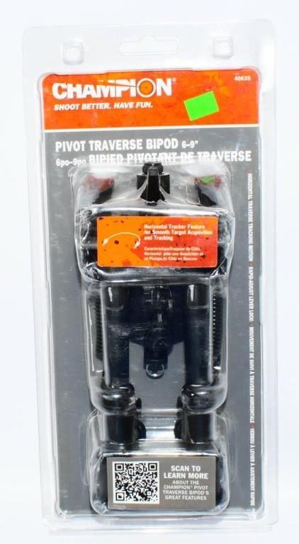 Greetings, firearm enthusiasts! Up for auction is the NIP (New in Package) Champion Pivot Traverse Adjustable Bipod. This versatile bipod provides stability and flexibility, with an adjustable height ranging from 6 to 9 inches, all packaged in a sleek black metal design. The new Champion Pivot Traverse Bi-pod delivers smooth rotation and a steady hold for staying on moving game, switching between animals, or engaging multiple targets at the range. Its innovative technology enables a shooter to horizontally traverse back and forth. This expands the field of fire and produces increased shooting options without the need to reposition the rifle. With the rapid adjust lever lock the bipod can go from a fluid swivel to rock steady lock down in seconds. Features and Specifications: Manufacturer Number: 40635 Horizontal traverse for smooth target acquisition and tracking Pivot/cant action for level shooting on uneven terrain Rapid adjust lever lock Durable all metal construction with rugged tubular leg construction Spring return telescoping legs Easily attaches to sling swivel stud Black