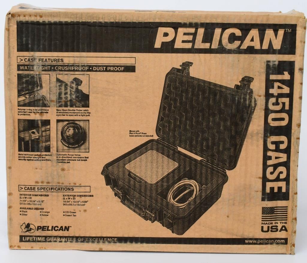 Greetings, firearm enthusiasts! Safeguard your handguns with this Secure Elegance: New In The Box Pelican 1450 Pistol Hardcase. Unbox uncompromising protection in the form of a Pelican hardcase designed to keep your pistols secure and stylish. Embark on this bidding journey for Secure Elegance: New In The Box Pelican 1450 Pistol Hardcase. Bid with confidence and secure this hardcase that promises unparalleled protection for your handguns. Place your bids now and elevate the security of your firearm collection with this sleek Pelican case! Pelican Protector Case Protective Case, Medium, Series: 1450, 16.54 in Outside Length, 13.03 in Outside Width, 6.84 in Outside Height, 14.66 in inside Length, 10.24 in inside Width, 6.12 in inside Height, 0.53 cu-ft, Polypropylene, Black, 1-3/4 in Lid Depth, 4.37 in Bottom Depth, ABS Latch Mobility with room for protecting larger gear or multiple instruments and accessories. interior options are available for extra protection. Select models meet carry-on luggage specifications. Most cases are available empty, with foam or padded dividers.