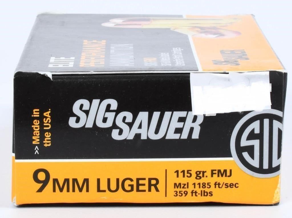 100 Rounds Of Sig Sauer 9mm Luger Ammunition 115 Grain Ammo , FMJ, SIG Sauer Elite Performance 9mm ammunition offers the best reliability and accuracy for training at the range or competition use. This 9mm pistol ammunition features dependable primers and clean burning powders to reduce fouling and ensure firearm functionality. The cartridge is composed of reloadable brass cartridges and durable copper jacketed bullets that stay with the lead on impact for increased penetration. Go to the range with the perfect combination of performance and affordability with the SIG Sauer Elite Performance Ammunition. Features and Specifications: Manufacturer Number:E9MMB1 Caliber: 9mm Bullet Type: Full Metal Jacket Bullet Weight: 115 Grain Muzzle Velocity: 1246 fps 25 Yard Velocity: 1185 fps 50 Yard Velocity: 1076 fps Muzzle Energy: 359 ft/lbs 25 Yard Energy: 323 ft/lbs 50 Yard Energy: 296 ft/lbs Casing: Reloadable Brass Usage: Target Shooting, Training, Competition, Plinking