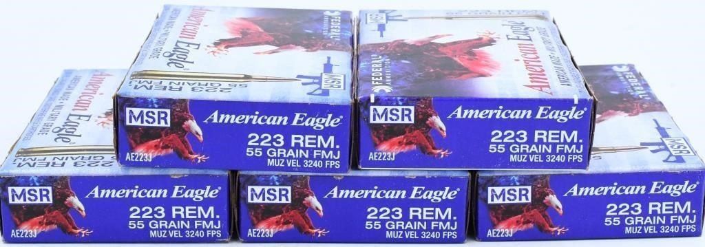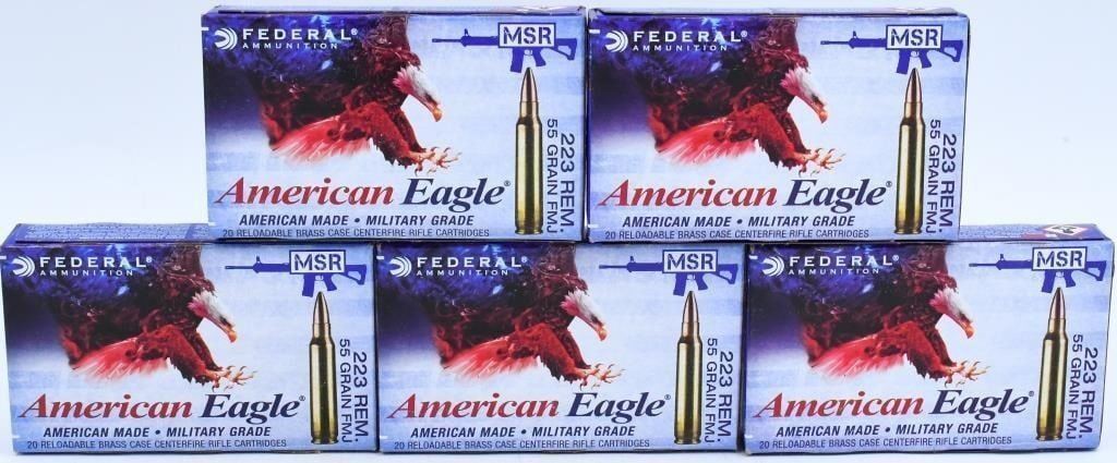 Secure 100 rounds of Federal 5.56x45 NATO ammunition, presented in 5 brand new boxes with 20 rounds per box. Each box contains Federal American Eagle 5.56x45mm 55 Grain Full Metal Jacket (FMJ) rounds, boasting a velocity of 3165 feet per second. Federal American Eagle ammunition is well-regarded for its reliability and consistent performance. The 55-grain FMJ construction ensures smooth feeding and reliable cycling in your 5.56x45 NATO firearms, making it suitable for various shooting applications. Bid with confidence on this opportunity to acquire 100 rounds of Federal 5.56x45 NATO ammunition and enhance your shooting experience with high-quality, reliable rounds. Note: Please ensure compliance with local and state regulations regarding the purchase and possession of ammunition.