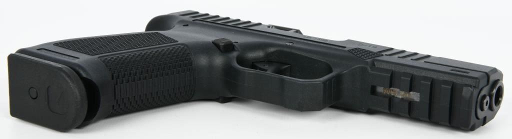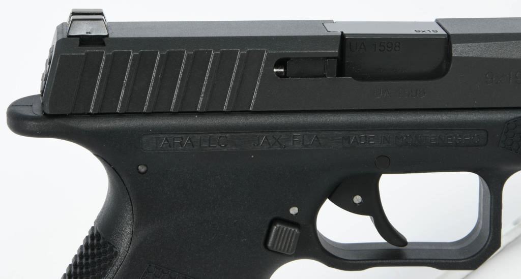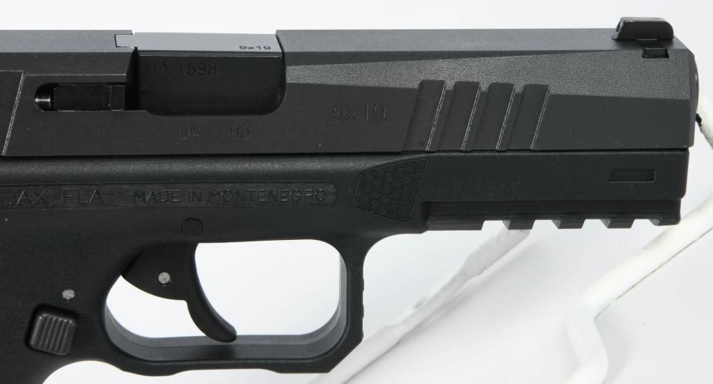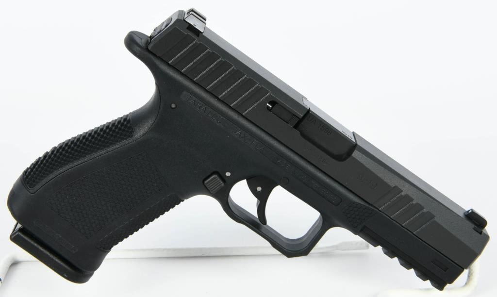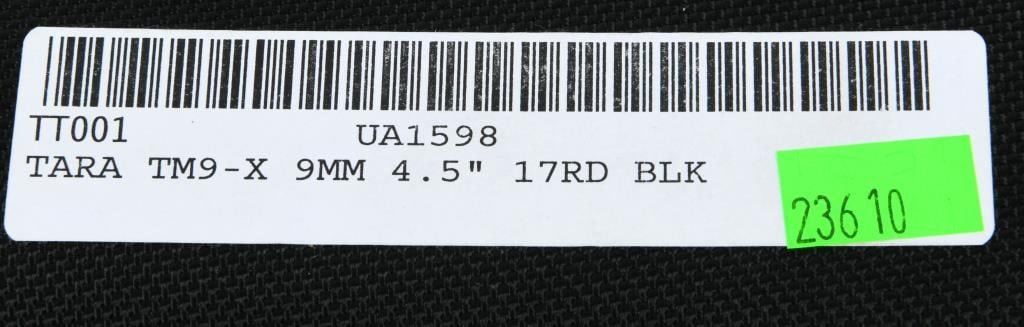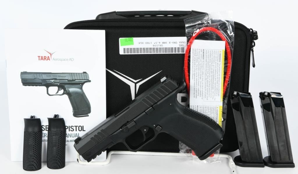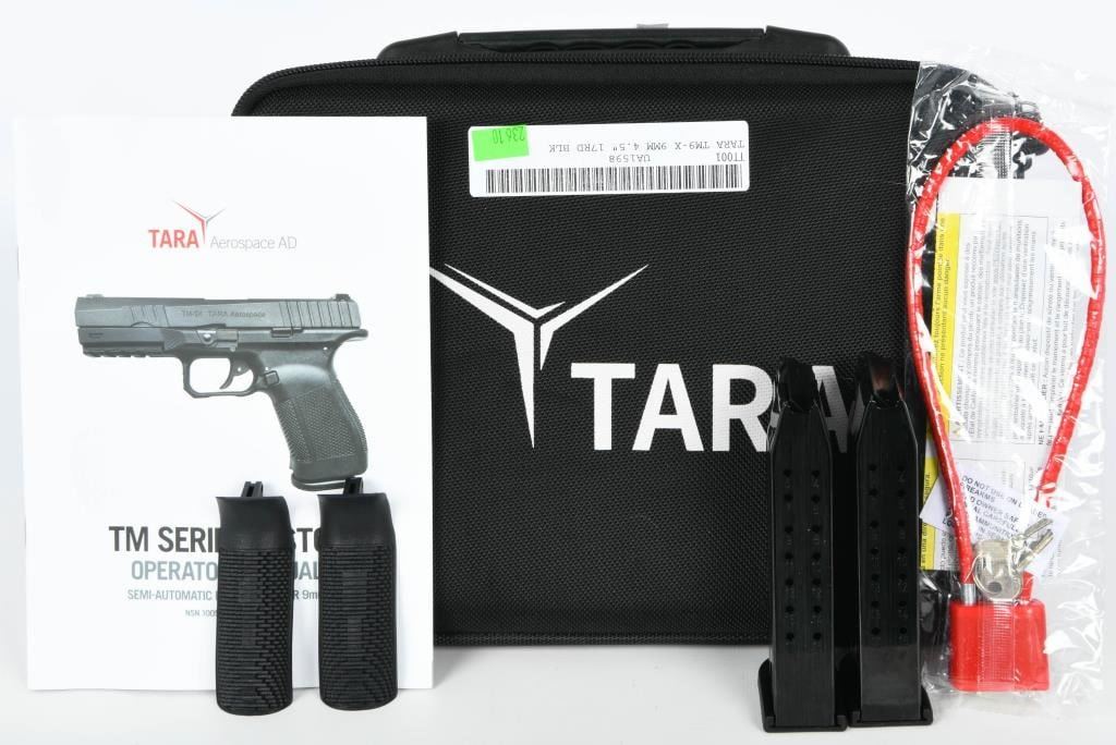 Introducing the Tara Aerospace TM-9X Semi Auto Pistol, a cutting-edge 9MM firearm that arrives brand new from the factory, securely encased in the original case. This package includes three magazines, a lock, and all the necessary paperwork, neatly organized within a zippered carry case. Hailing from the distinguished TARA Aerospace AD in Montenegro, this 4.5" striker-fired pistol brings a touch of aerospace precision to the world of firearms. Chambered in 9mm, the TM-9X boasts a sleek design with traditional 3-dot sights, a polymer frame, and tilting lock-up mechanism. Meticulously crafted features include an ambidextrous magazine release, double action/single action capability, and a stainless steel slide, ensuring durability and reliability. The patented Double Action Short Release (DASR) trigger sets this pistol apart, providing a unique and responsive shooting experience. Enhancing both form and function, the TM-9X showcases an aesthetically pleasing honeycomb grip texture, an extended beavertail for added control, and three interchangeable backstraps to customize your grip. The inclusion of three proprietary magazines makes it a versatile choice for any training course, ensuring you're well-prepared for various scenarios. Bid with confidence on this Tara Aerospace masterpiece, where innovation meets precision in a 9mm semi-auto pistol designed to elevate your shooting experience. Secure your opportunity to own this outstanding firearm, brand new and ready for action.