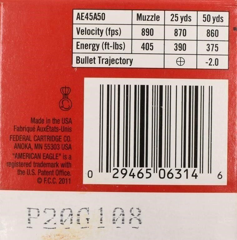 Secure 100 rounds of American Eagle .45 Auto ammunition, featuring a reliable 230-grain Full Metal Jacket (FMJ) bullet. Designed for the iconic 45 Automatic Colt Pistol (ACP) caliber, these rounds provide consistent performance and accuracy. With a muzzle energy of 404 ft lbs and a muzzle velocity of 890 fps, American Eagle ammunition delivers the power and velocity needed for various shooting applications. Whether you're at the range for practice or relying on your .45 Auto for personal defense, these rounds offer the quality and reliability associated with the American Eagle brand. Bid confidently on this opportunity to acquire 100 rounds of American Eagle .45 Auto ammunition and enhance your shooting experience with reliable, full metal jacket rounds. Note: Please ensure compliance with local and state regulations regarding the purchase and possession of ammunition.