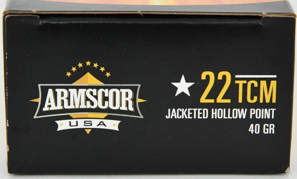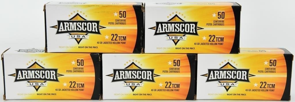 Up Next We Have 5 Boxes of 50 Rounds Each for a Total of 250 Rounds of Armscor .22 TCM Ammo, 40 Grain Jacketed Hollow Points. Armscor USA 22 TCM 40 Grain JHP 50 Round Box (Not .22LR) Armscor ammunition is well known to be an excellent choice for high volume shooting for training, competition, and recreational shooting. Using reloadable brass casing, high quality components, and made to exacting standards ensures that shooters have the best ammo to suite their needs. Pick up a couple boxes of Armscor Ammo and give them a shot, like most shooters, you will be back for more. .22 TCM 40 Grain Jacketed Hollow Point Brass Cased Reloadable Muzzle velocity: 1875 fps Muzzle energy: 312 ft/lbs Uses: Target Shooting, Training, and Plinking