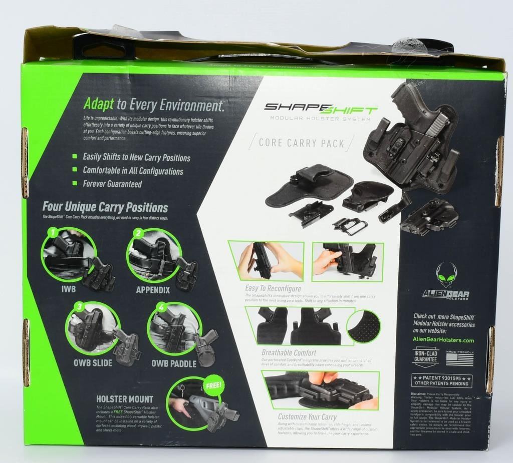 Greetings, firearm enthusiasts! Up for auction is the Alien Gear Shapeshift Holster designed for the Springfield XDM 3.8-inch model. This holster is more than just a piece of gear; it's a modular carry pack that adapts to your preferences, providing both inside-the-waistband (IWB) and outside-the-waistband (OWB) carry options. The ShapeShift core carry pack, formerly known as the starter kit, has been renamed to better represent the four most popular "core" carry styles within Alien Gear's growing modular holster system. The ShapeShift core carry pack is the foundation of the ShapeShift modular holster system, and includes everything you need to carry in four distinct ways. In just a few quick steps, quickly transform the ShapeShift into an IWB holster, appendix carry holster, OWB belt slide, and OWB paddle holster