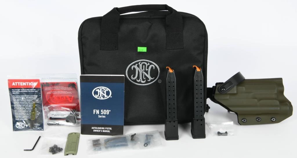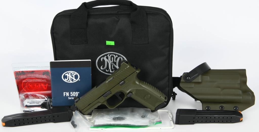 Introducing the FNH 509 Tactical 9mm in OD Green, a semi-automatic pistol that combines versatility and performance. This firearm is presented in excellent preowned condition and comes with valuable accessories. The FNH 509 Tactical is based on FN's submission for the U.S. Army's Modular Handgun Trials, featuring enhancements from the FN 509 design. The pistol is equipped with a patent-pending Low-Profile Optics Mounting System, allowing it to accept more than ten commercially-available miniature red dot optics. The system ensures co-witness with suppressor-height night sights and remains adaptable to future optics releases without the need for direct milling of the slide. In this package, the pistol comes in an OD Green finish and includes a Safariland tactical holster for convenient carry. The firearm is accompanied by a soft padded carry case, providing protection during transport. Additionally, the pistol is upgraded with an Apex action enhancement kit trigger, enhancing its overall performance. The package includes the factory OEM trigger as well. The FNH 509 Tactical stands out with features such as a slide cap that protects iron sight alignment if the pistol is dropped or jostled. The cap also provides a textured ramp for racking the slide against a belt loop, pant pocket, or boot. With a total of three magazines included, this FNH 509 Tactical package offers a well-rounded and adaptable solution for shooters seeking a reliable and feature-rich 9mm pistol.
