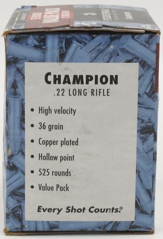 Secure 525 rounds of Federal Champion .22 LR ammunition, featuring reliable 36-grain Plated Lead Hollow Point projectiles. Federal Champion is known for its quality and consistency, making this ammunition an excellent choice for plinking, target practice, and recreational shooting. The 36-grain Plated Lead Hollow Point bullets provide reliable performance and accuracy in your .22 LR firearms. This ammunition is suitable for a variety of shooting applications, offering an affordable and enjoyable shooting experience. Bid confidently on this opportunity to acquire 525 rounds of Federal Champion .22 LR ammunition, enhancing your shooting sessions with high-quality, plated lead hollow point rounds. Note: Please ensure compliance with local and state regulations regarding the purchase and possession of ammunition.
