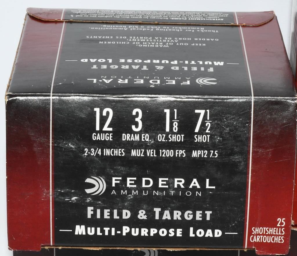 Secure 100 rounds of Federal 12 Ga Field & Target shotshells, designed for versatility and performance. These 2 3/4" shotshells come loaded with 1 1/8 oz of shot, making them ideal for both field hunting and target shooting applications. The plastic shotshells are crafted to deliver consistent patterns and reliable performance, ensuring you have an effective and enjoyable shooting experience. Federal is recognized for producing quality ammunition, and these shotshells are no exception. Bid confidently on this opportunity to acquire 100 rounds of Federal 12 Ga Field & Target shotshells, offering a reliable and versatile option for your shotgun needs. Note: Please ensure compliance with local and state regulations regarding the purchase and possession of ammunition.