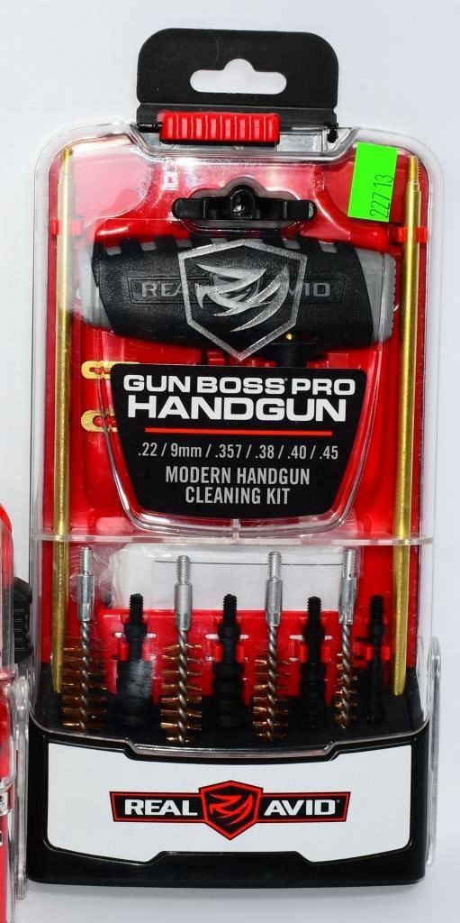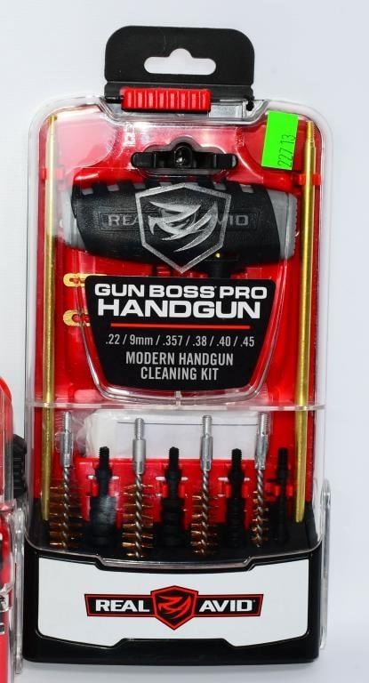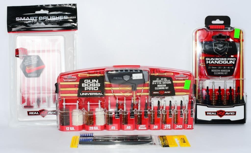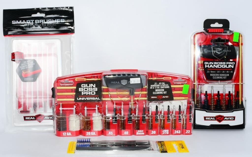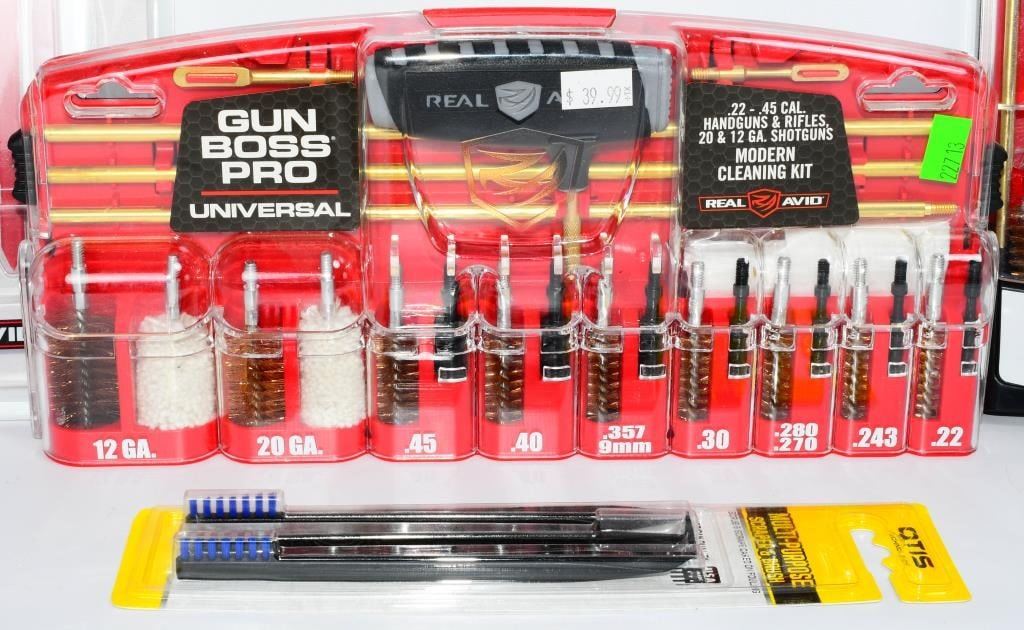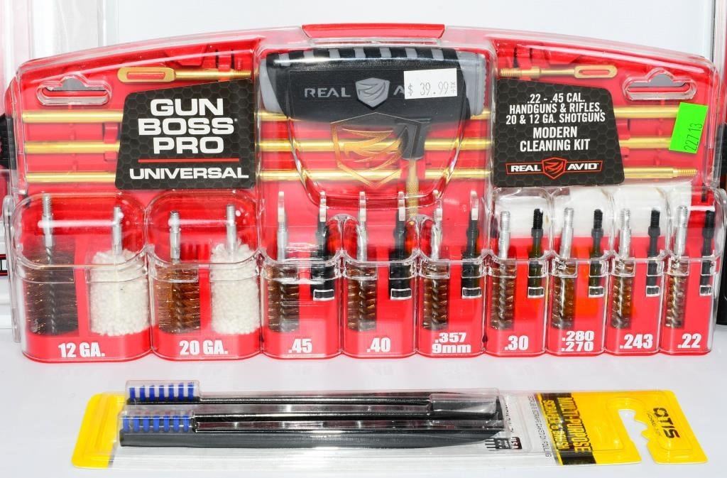 New in the Package Gun Cleaning Kits & Accessories, Includes 1 Otis Multi Purpose Scraper & Brush , 1 Pack Of 8 Super Scrubber Gun Brushes With Integrated Scrapers, 1 Real Avid Gun Boss Pro Handgun Cleaning Kit for Modern Handguns, & 1 Real Avid Gun Boss Pro Modern Gun Cleaning Kit Hello, firearm enthusiasts! Delve into the world of pristine firearms with this comprehensive bundle of New in the Package Gun Cleaning Kits & Accessories. This package includes top-notch items to keep your firearms in impeccable condition. Get ready to bid confidently on this all-inclusive set that ensures your firearms receive the care they deserve. Key Features: Otis Multi-Purpose Scraper & Brush: This package includes the versatile Otis Multi-Purpose Scraper & Brush, a must-have tool for maintaining your firearms. Bid confidently on a tool designed for precision cleaning and maintenance. Super Scrubber Gun Brushes with Integrated Scrapers: Included in the bundle is a pack of 8 Super Scrubber Gun Brushes with Integrated Scrapers. These brushes ensure a thorough cleaning, and the integrated scrapers add an extra layer of precision to your maintenance routine. Real Avid Gun Boss Pro Handgun Cleaning Kit: Elevate your handgun maintenance with the Real Avid Gun Boss Pro Handgun Cleaning Kit. Bid boldly on this kit designed specifically for modern handguns, offering everything you need for a thorough cleaning. Real Avid Gun Boss Pro Modern Gun Cleaning Kit: The package is completed with the Real Avid Gun Boss Pro Modern Gun Cleaning Kit, ensuring that your modern firearms receive the care they deserve. Bid confidently on a comprehensive kit that covers all your cleaning needs. Embark on this bidding adventure for the New in the Package Gun Cleaning Kits & Accessories Bundle. Don't miss the chance to own high-quality gun cleaning tools and accessories. Place your bids now and give your firearms the care they need to shine!