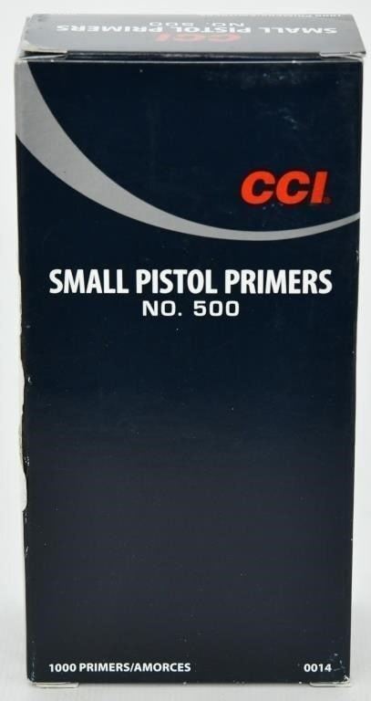 1000 Count CCI #500 Standard Small Pistol Primers Up Next We Have a Lot of 1000 CCI Standard Small Pistol Primers #500, CCI Primers are continuously tested and improved. As a result today's CCI primers are more sensitive, easier to seat and more compatible with progressive and automated loading equipment than ever before. They utilize modern non-corrosive and non-mercuric initiator mixes for the cleanest burn possible. These are the ?bread-and-butter? of reloading, the most commonly called-for primers in reloading recipes. CCI standard primers are remarkably clean-burning, leaving primer pockets cleaner and extending the time between pocket cleaning. That?s a huge benefit for progressive reloaders. They are more sensitive and easier to seat than older CCI primers, and engineered for smooth feeding in automated equipment. NO HAZMAT FEES!!!