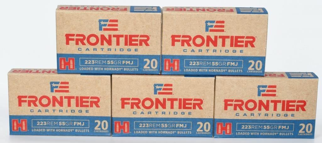 Secure 100 rounds of Frontier .223 Rem ammunition, featuring 55-grain full metal jacket ammo loaded with Hornady bullets. Manufactured in the USA, Frontier ammunition is known for its quality and reliability. The 55-grain full metal jacket construction ensures smooth feeding and reliable cycling in your .223 Rem firearms. Loaded with Hornady bullets, these rounds offer a combination of precision and performance that's trusted by shooters across various applications. Bid confidently on this opportunity to acquire 100 rounds of Frontier .223 Rem ammunition, enhancing your shooting experience with high-quality and reliable ammunition loaded with Hornady bullets. Note: Please ensure compliance with local and state regulations regarding the purchase and possession of ammunition.