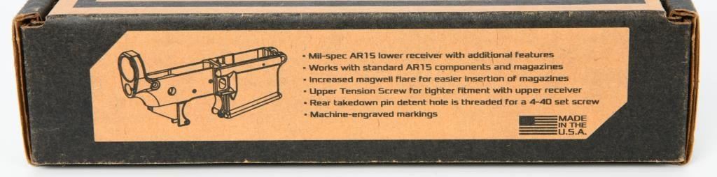 Up Next is a Brand New Aero Precision AR15 Stripped Lower Receiver Gen 2, and Comes in the Factory Box. Aero Precision Stripped AR-15 Lower Receiver, Gen 2, Black. This Aero Precision Gen 2 AR-15 stipped lower receiver is manufactured for AR-15 platform rifles chambered in .223 Rem and 5.56x45mm. Machined from 7075-T6 forged aluminum, this receiver features an anodized black finish, increased magwell flare for easier insertion of magazines, an upper tension screw to allow fine tuning and works with standard AR-15 components and mags. This piece also includes engraved markings and the rear takedown pin detent hole is threaded for a 4-40 set screw. This receiver is perfect for your next workshop project or as an immediate upgrade to your current AR-15 project. Features: Made in America 7075-T6 Forged Aluminum Anodized Black Works with Standard AR-15 Components and Mags 8.35oz Includes: Stripped AR15 Lower Receiver, Gen 2 Nylon tipped tensioning set screw