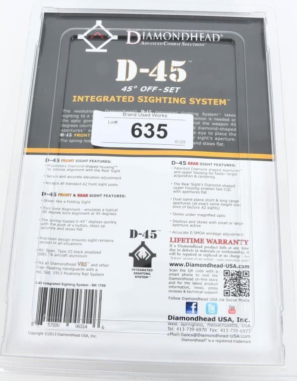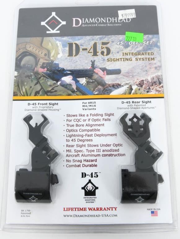 Diamondhead AR-15 D-45 Integrated Swing Sighting, Front and rear AR-15 45 degree offset sights that stow away under optics, and swing out at a 45 degree offset for quick use of iron sights in closer quarters. The Diamondhead D-45 integrated sighting system provides visual reference points during high speed, high stress shooting. The conventional rear sight's round aperture and round (HK style) front sight housing, can make shooting at longer distances difficult and inaccurate. Remember, rear sights are blurry during aiming. The simple fact is that it is easier for the eye to find the exact center of a blurry diamond than the exact center of a blurry circle. It is even easier and quicker for the eye to find the exact center of a Diamondhead rear sight's aperture with the added posts at the corner of the diamond. These proprietary reference posts are unique to the Diamondhead sight and are not found on any other iron sight. The re-styled upper housing of the rear sight makes rapid aiming even easier and for CQC aiming, target acquisition can be made with the apertures flat and by merely aligning the rear upper housing with the front sight post. The other main reason the Diamondhead diamond-shaped aperture is better than a conventional round aperture is because round apertures don't give a truly ROUND picture of the front sight and target. The front sight tower of the rifle obscures the bottom portion of the conventional rear sight round aperture. This causes the the bottom part of the round aperture to be flattened - not round. The result is that it is harder for the eye to quickly make an accurate decision about how high up in this flattened circle is the exact center. Take a look at a set of conventional round sights to see. The 3:00 o'clock and 9:00 o'clock corners of the Diamondhead aperture, combined with the added accuracy of the proprietary Diamond-shaped upper housing eliminates this problem. Used in combination with the Diamondhead DIAMOND Flip-Up Front Combat Sight or the Diamondhead "Auto-Ranger" Flip-Up Front Combat Sight, there will always be a clear reference for considerably more accurate (and faster) target acquisition. Features and Specifications: Rear Sight: Patented Diamond-Shaped Apertures and upper housing for faster target acquisition and centering Rear Sight's Diamond-shaped upper housing enables fast CQC with apertures flat Dual same plane short and long range apertures (at exact height of factory A2 sights) Stows under magnified optic Deploys and stows with small or large aperture active Accurate 0.5MOA windage adjustment Front Sight Proprietary Diamond-Shaped housing Secure and accurate elevation adjustment Accepts all standard A2 front sight posts
