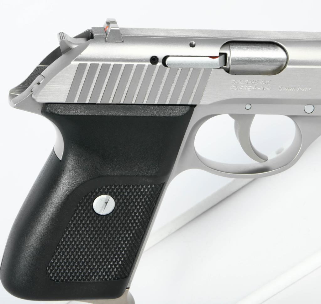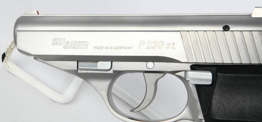 The Sig Sauer P230, particularly in its stainless steel variation, is a distinguished semi-automatic pistol with roots in German firearm engineering. Produced in Germany, this compact and elegant handgun has earned a place in the annals of firearms history. Introduced in the 1970s, the P230 was designed as a concealed carry and self-defense firearm, catering to those who sought a reliable and well-crafted pistol. The stainless steel version not only adds to the aesthetics but also enhances durability and corrosion resistance. The P230, chambered in 9mm Kurz (.380 ACP), operates on a blowback mechanism and features a fixed barrel. The inclusion of a decocking lever contributes to its user-friendly design, allowing for a safer decocking procedure. The vintage factory box and German proof marks serve as indicators of the pistol's authentic origin and craftsmanship. One could imagine the P230 being holstered by law enforcement officers patrolling the streets or discreetly carried by civilians concerned about personal safety. Its compact size, coupled with the reliability synonymous with Sig Sauer, made it a popular choice for those who valued both form and function in their firearms. The history of the Sig Sauer P230 is interwoven with the broader narrative of firearm development and the evolution of concealed carry preferences. As a symbol of German precision and excellence in gunmaking, the P230 has become a collector's item and a piece of history for those who appreciate fine craftsmanship and the reliability of a well-engineered firearm. Its legacy endures as a testament to Sig Sauer's commitment to producing firearms that stand the test of time.