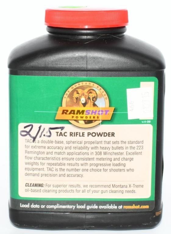 Embark on a journey of precision reloading with our exclusive auction featuring a 1 lb canister of Ramshot Tac Rifle Gun Powder. Known for its ability to deliver some of the industry's highest velocities for 80-grain bullets in the .223 caliber while adhering to SAAMI pressure guidelines, Tac is a double-based powder that ensures ease of metering and consistent charge weights. This canister of Ramshot Tac is your ticket to achieving optimal performance and accuracy in your reloads. Before participating in the auction, ensure awareness of local and state laws governing reloading components. Bid confidently, knowing you are vying for a pound of top-tier Ramshot Tac Rifle Gun Powder, trusted for its reliability and performance. Secure this lot and elevate your reloading experience with the precision-engineered qualities of Ramshot Tac. Happy bidding, and may the winning bid bring home this sought-after canister of Ramshot Tac, enhancing your reloading capabilities with consistent charge weights and industry-leading velocities. Get your bid on and seize the opportunity to own this premium reloading component.