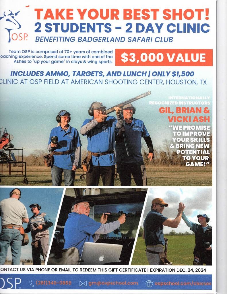 TAKE YOUR BEST SHOT! 2 Students for 2 days will learn and refine their skills from the best at OSP Field at the American Shooting Center, Houston Texas. Learn from internationally recognized instructors Gil, Brian and Vicki Ash with their 70+ years of combined coaching experiance. They promise to improve your skills. Includes: Ammo, Targets, and Lunch Must be scheduled in 2024 Value $3000.00 100% Donation (281)346-0888 Donated by: Optimum Shotgun Performance School & Portage Rod & Gun Club