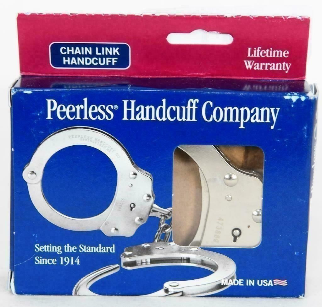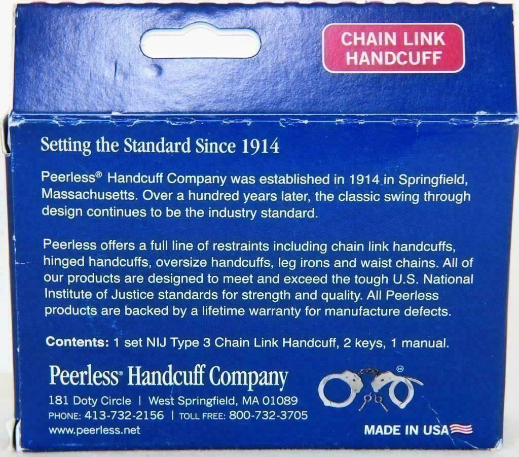 Peerless Handcuff Company 700CN Chain Link Handcuff, New Peerless Handcuff Company 700CN Chain Link Handcuffs Nickel Plated, These 700CN chain link handcuffs from Peerless Handcuff Company incorporate spun rivet construction for absolute strength and durability. These handcuffs feature a profiled edge that prevents nerve and tissue damage. Their smooth single strand action is designed for fast and efficient cuffing. Specifications and Features: Nickel Spun rivet construction for strength and durability Smooth single strand action allows for fast and efficient cuffing Profiled edge minimize the risk of tissue and nerve injury Approved by national Institute of Justice Double locking Two keys supplied Made in USA