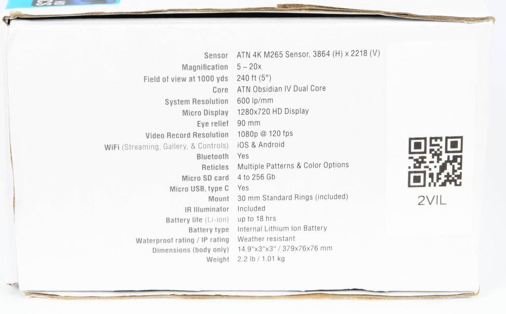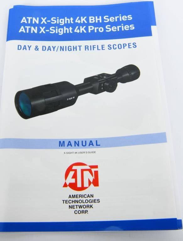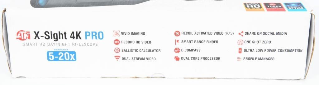 NIB ATN X-Sight 4K Pro 5-20X Night Vision Scope The ATN X-Sight-4k, 5-20x Pro edition Smart Day/Night Hunting Rifle Scope with Full HD Video rec, WiFi, GPS, Smooth zoom and Smartphone controlling thru iOS or Android Apps, Black, DGWSXS5204KP Magnification: 5 - 20 x, Eye Relief: 90 mm, Length: 13.8 in, 14.9 in, Width: 3 in, Height: 3 in, Weight: 2.2 lb, Range of Detection: 10 m, Color: Black, Video Record Resolution: 1920x1080 pixels, Memory: Up to 64GB SD card, Objective Lens Diameter: 70 mm, Focus Range: 10 m to Infinity, Diopter Adjustment Range: -5 - 5 dpt, Minimum Focus Distance: 10 m, Tube Diameter: 30 mm, Reticle: Multiple, Image Intensifier Color: Green Phosphor, System/Lens Resolution: 600 lp/mm, Display Resolution: 1280x720 pixels, Refresh Rate: 120 Hz, 30 Hz, 60 Hz, Resolution: 3864x2218 pixels, Field of View, Linear: 240 ft at 1000 yds, Field of View, Angle: 5 degrees, Lens Material: Glass, Operating Temperature: -20 - 120 Fahrenheit, -28 - 48 Celsius, Battery Life: 18 + Hours, Weather Resistance: Yes, Water Resistance Level: Water Resistant, Shockproof: Yes, Fogproof: Yes, Fabric/Material: Aluminum, Condition: New, Included Accessories: Standard, Battery Quantity: 1, Dimensions: 13.8x3x3 in,