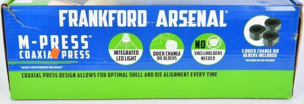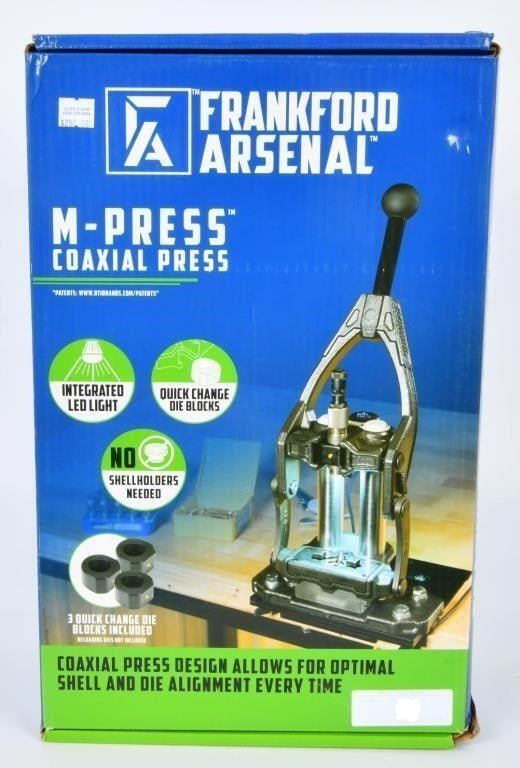 New Frankford Arsenal Reloading Single Stage Press, The Frankford Arsenal M-Press Coaxial Reloading Single Stage press was designed for the serious reloaders who demands the most precision ammunition possible. This press features a universal shell holder system and an easy to empty spent primer tray. Frankford Arsenal's proprietary M-Press was designed to deliver unmatched accuracy at the bench and in the field. Frankford Arsenal M-Press Coaxial Reloading Press Specifications and Features: Frankford Arsenal 1097879 M-Press Coaxial Reloading Press Easy To Adjust Quick Change System Spent Primer Catcher Loads a Variety of Cases 2 Parallel Guide Rods