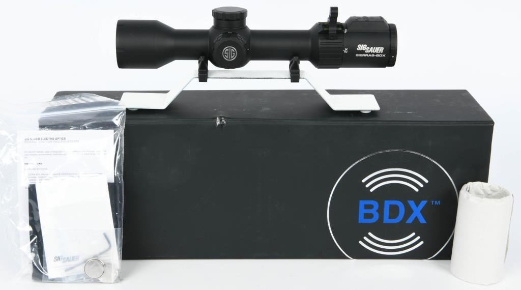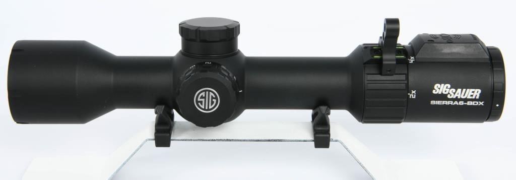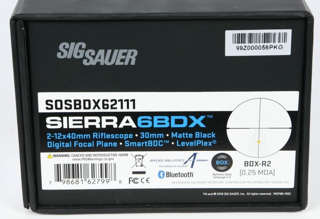 NIB Sig Sauer Sierra 6BDX 2-12x40mm Rifle Scope, 30mm Tube BDX-R2 Ballistic Reticle 0.25 MOA Adjustment Bluetooth Take the guesswork out of your shooting with the SIERRA6BDX rifle scope. BDX, Ballistic Data Exchange 2.0, technology allows you to pair your rifle scope to a BDX and Bluetooth equipped range finder for intelligent auto-holdover specific to the ballistics of your ammunition, target, and environment. Advanced HDX technology combines high definition digital imagery with high transmission glass for optimal performance and light transmission. The lenses of the SIERRA6BDX are coated with LensArmor and LenShield for superior abrasion protection and the ability to shed water, oil, and debris to ensure a clean sight image. To promote the ethical harvesting of game the SIERRA6BDX has KinETHICTM software to let you know if game is within the practical ballistic capabilities of your ammunition. Purged with argon gas and waterproof and fog-proof, the SIERRA6BDX has an IPX7 rating for complete immersion up to 1 meter. For long-range shooting the LevelplexTM digital level helps detect barrel cant to keep your optic horizontal and your shots on target. Loaded with advanced technology the SIERRA6BDX can improve your odds for a successful hunt. Sig Sauer SIERRA6BDX Rifle Scope Specifications and Features Sig Sauer Item Number SOSBDX62111 2-12x Magnification 40mm Coated Objective Lens 30mm Tube 2nd Generation Digital Focal Plane BDX-R2 Illuminated Reticle 0.25 MOA per Click Adjustment 20 MOA Travel Per Rotation 60 MOA Total Windage and Elevation Travel Parallax 100 yd Field of View at 100 yd 2x 52.5' at 12x 8.7' Eye Relief 3.9" 8 Daytime and 2 Night Vision Illumination Settings Weight 21.4 oz IPX7 Waterproof Black Finish