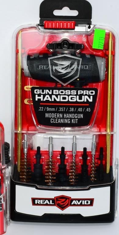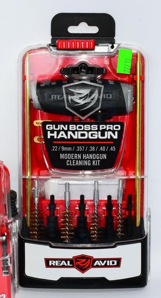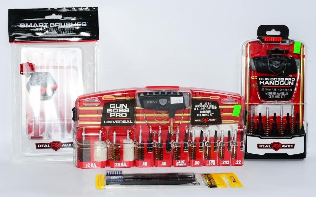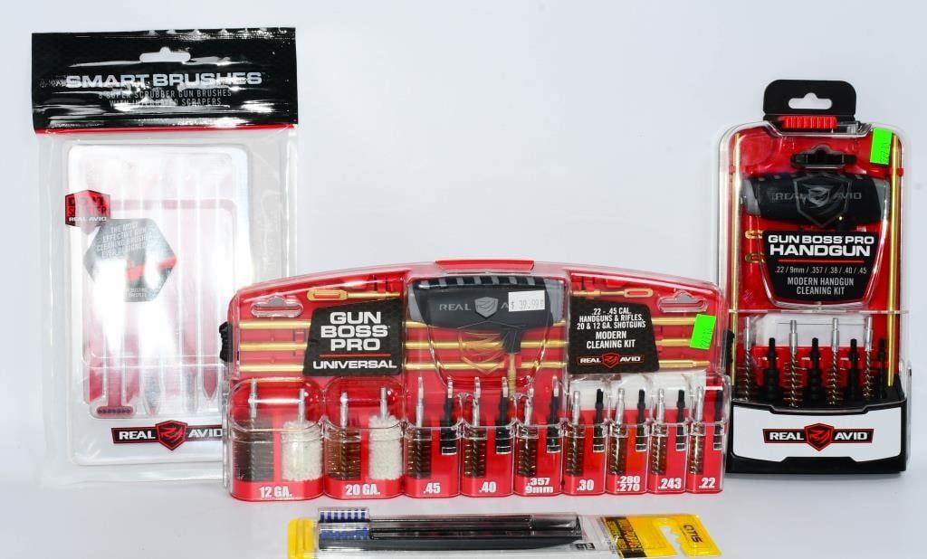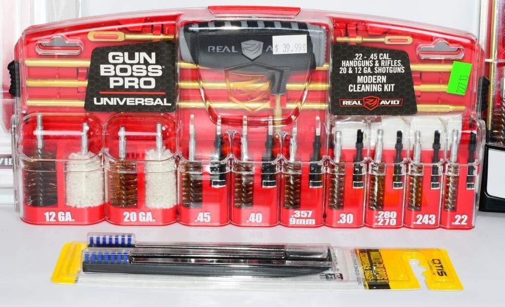 New in the Package Gun Cleaning Kits & Accessories, Includes 1 Otis Multi Purpose Scraper & Brush , 1 Pack Of 8 Super Scrubber Gun Brushes With Integrated Scrapers, 1 Real Avid Gun Boss Pro Handgun Cleaning Kit for Modern Handguns, & 1 Real Avid Gun Boss Pro Modern Gun Cleaning Kit Hello, firearm enthusiasts! Delve into the world of pristine firearms with this comprehensive bundle of New in the Package Gun Cleaning Kits & Accessories. This package includes top-notch items to keep your firearms in impeccable condition. Get ready to bid confidently on this all-inclusive set that ensures your firearms receive the care they deserve. Key Features: Otis Multi-Purpose Scraper & Brush: This package includes the versatile Otis Multi-Purpose Scraper & Brush, a must-have tool for maintaining your firearms. Bid confidently on a tool designed for precision cleaning and maintenance. Super Scrubber Gun Brushes with Integrated Scrapers: Included in the bundle is a pack of 8 Super Scrubber Gun Brushes with Integrated Scrapers. These brushes ensure a thorough cleaning, and the integrated scrapers add an extra layer of precision to your maintenance routine. Real Avid Gun Boss Pro Handgun Cleaning Kit: Elevate your handgun maintenance with the Real Avid Gun Boss Pro Handgun Cleaning Kit. Bid boldly on this kit designed specifically for modern handguns, offering everything you need for a thorough cleaning. Real Avid Gun Boss Pro Modern Gun Cleaning Kit: The package is completed with the Real Avid Gun Boss Pro Modern Gun Cleaning Kit, ensuring that your modern firearms receive the care they deserve. Bid confidently on a comprehensive kit that covers all your cleaning needs. Embark on this bidding adventure for the New in the Package Gun Cleaning Kits & Accessories Bundle. Don't miss the chance to own high-quality gun cleaning tools and accessories. Place your bids now and give your firearms the care they need to shine!