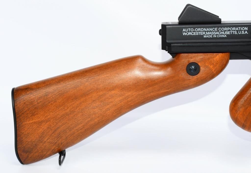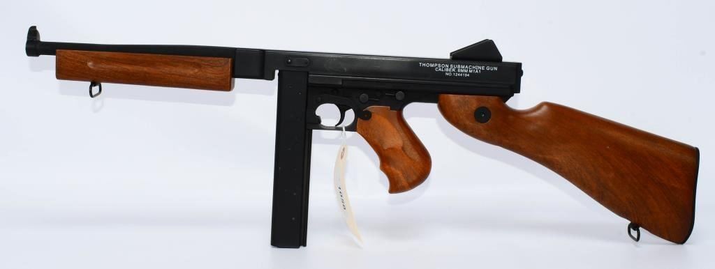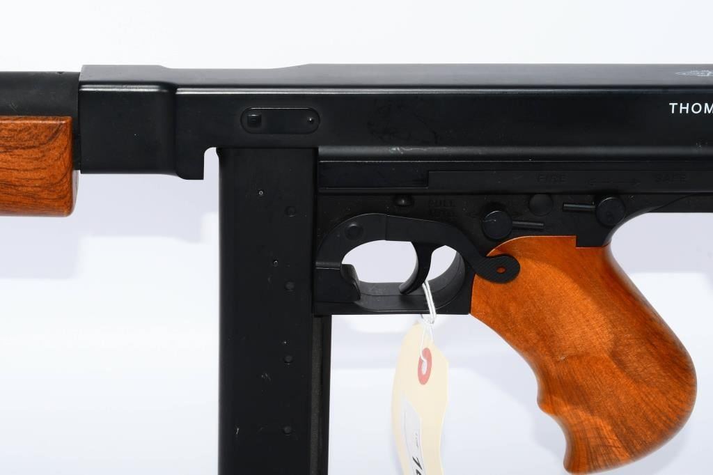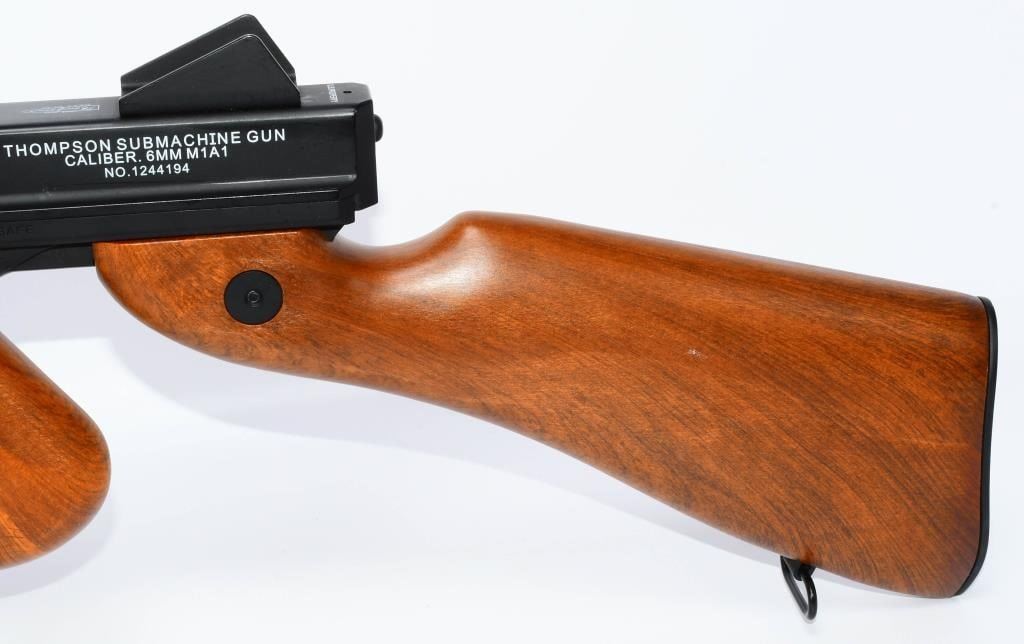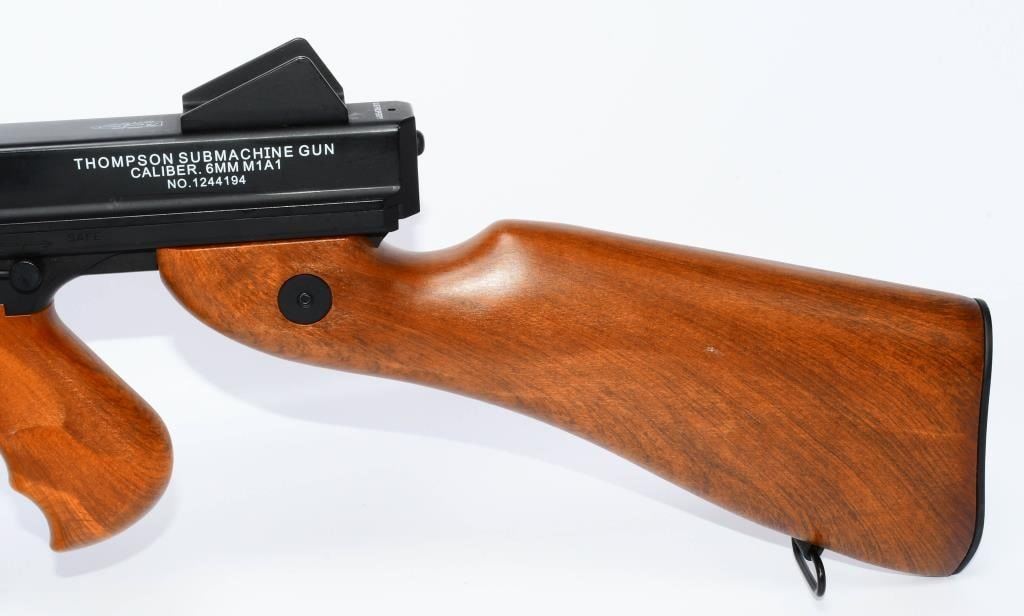 Hey Airsoft Warriors! Get ready for an epic showdown with the Thompson M1A1 AEG Airsoft Rifle. This battery-powered beast brings the heat with full-auto and semi-auto modes, ensuring you're always ready for action. With its sleek black finish and classic wood accents, this rifle is not just a powerhouse but a style statement on the field. Prepare for Victory! Bid confidently on this Airsoft Rifle that combines performance, style, and versatility. Whether you're storming the front lines or holding your ground, the Thompson M1A1 has got your back. Don't miss your chance to command the battlefield ? place your bid now! Founded in 1916, Thompson Auto-Ordnance produces possibly one of the most iconic weapons in US history, the Thompson Sub-Machine Gun. The weapon has become synonymous with the roaring 20s in film and media, and found wide spread use throughout the 30s and 40s during the 2nd World War. The majority of media and films depicting the Prohibition Era and World War 2 following it will most certainly feature the Thompson Sub-Machine Gun as it was a weapon favored by Gangsters and Lawmen alike and eventually finding its way into the hands of The Greatest Generation as they fought tyranny abroad. Today Thompson Auto-Ordnance still produces a civilian version of the Thompson Sub-Machine Gun which is still highly sought after by collectors and enthusiasts alike. Features Full original Logos and Trademarks Full Metal upper receiver & ABS lower King Arms steel gear / reinforced Marui compatible gearbox for maximum customization possibility Polished full metal body for authentic look and realistic weight High quality simulated wood grain finish High Power Automatic Electric Gun with Metal Gearbox Fully upgradeable Marui system / refer to our Thompson Videos Adjustable Hopup Accuracy System Comes With A.E.G Battery but No Charger