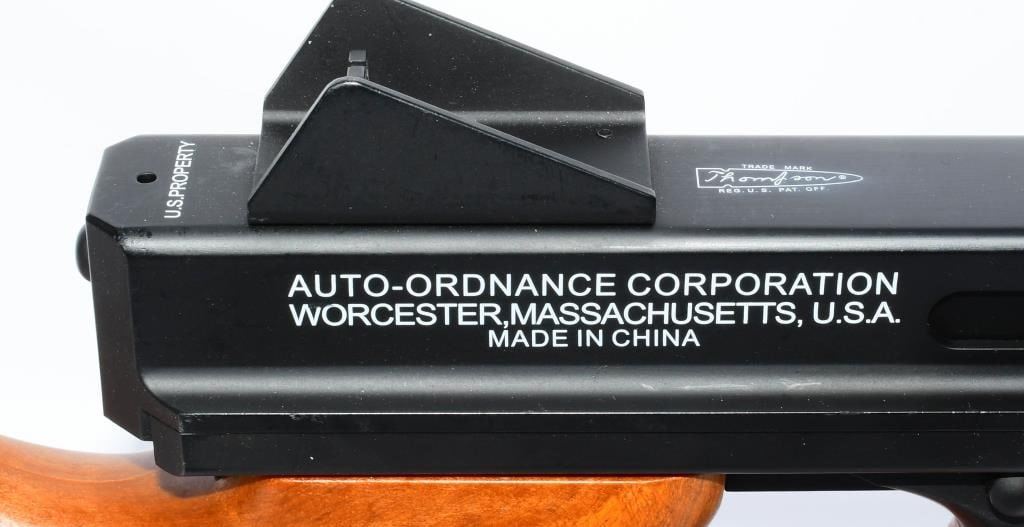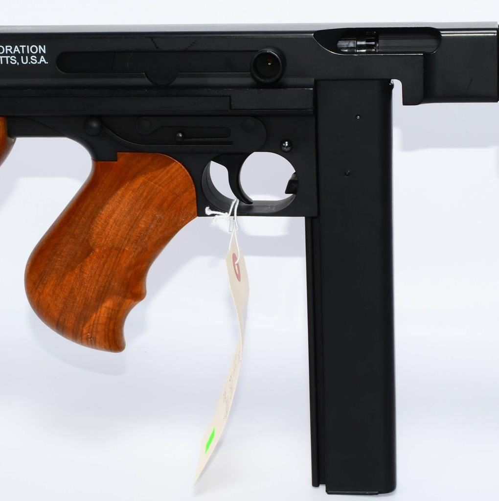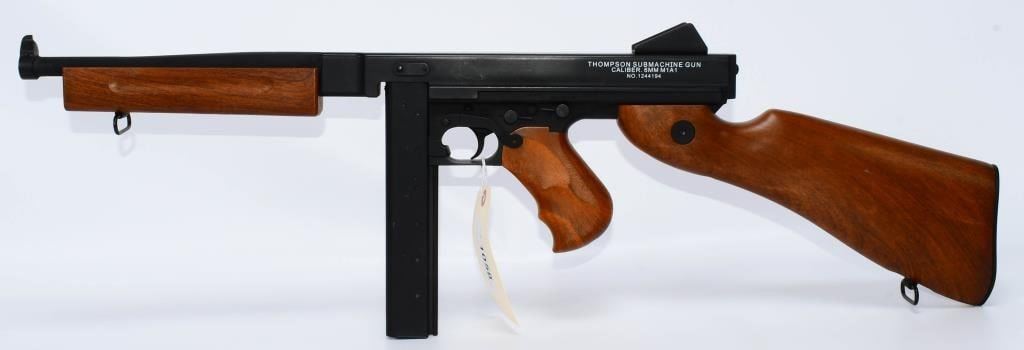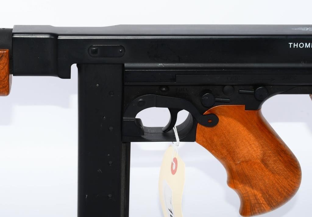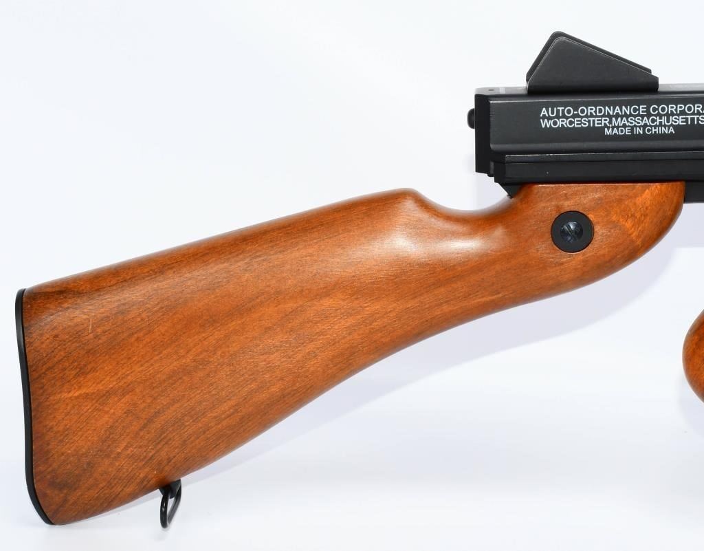 Hey Airsoft Warriors! Get ready for an epic showdown with the Thompson M1A1 AEG Airsoft Rifle. This battery-powered beast brings the heat with full-auto and semi-auto modes, ensuring you're always ready for action. With its sleek black finish and classic wood accents, this rifle is not just a powerhouse but a style statement on the field. Prepare for Victory! Bid confidently on this Airsoft Rifle that combines performance, style, and versatility. Whether you're storming the front lines or holding your ground, the Thompson M1A1 has got your back. Don't miss your chance to command the battlefield ? place your bid now! Founded in 1916, Thompson Auto-Ordnance produces possibly one of the most iconic weapons in US history, the Thompson Sub-Machine Gun. The weapon has become synonymous with the roaring 20s in film and media, and found wide spread use throughout the 30s and 40s during the 2nd World War. The majority of media and films depicting the Prohibition Era and World War 2 following it will most certainly feature the Thompson Sub-Machine Gun as it was a weapon favored by Gangsters and Lawmen alike and eventually finding its way into the hands of The Greatest Generation as they fought tyranny abroad. Today Thompson Auto-Ordnance still produces a civilian version of the Thompson Sub-Machine Gun which is still highly sought after by collectors and enthusiasts alike. Features Full original Logos and Trademarks Full Metal upper receiver & ABS lower King Arms steel gear / reinforced Marui compatible gearbox for maximum customization possibility Polished full metal body for authentic look and realistic weight High quality simulated wood grain finish High Power Automatic Electric Gun with Metal Gearbox Fully upgradeable Marui system / refer to our Thompson Videos Adjustable Hopup Accuracy System Comes With A.E.G Battery but No Charger