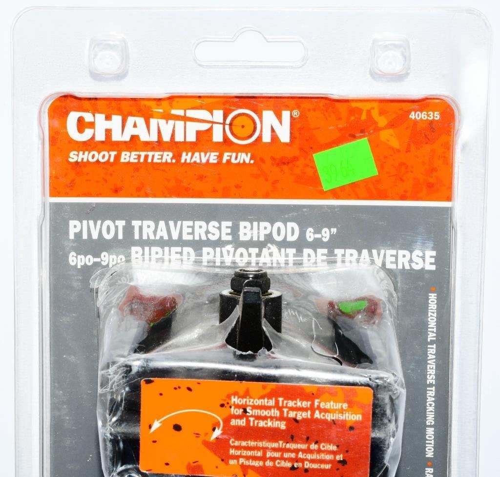 Greetings, firearm enthusiasts! Up for auction is the NIP (New in Package) Champion Pivot Traverse Adjustable Bipod. This versatile bipod provides stability and flexibility, with an adjustable height ranging from 6 to 9 inches, all packaged in a sleek black metal design. The new Champion Pivot Traverse Bi-pod delivers smooth rotation and a steady hold for staying on moving game, switching between animals, or engaging multiple targets at the range. Its innovative technology enables a shooter to horizontally traverse back and forth. This expands the field of fire and produces increased shooting options without the need to reposition the rifle. With the rapid adjust lever lock the bipod can go from a fluid swivel to rock steady lock down in seconds. Features and Specifications: Manufacturer Number: 40635 Horizontal traverse for smooth target acquisition and tracking Pivot/cant action for level shooting on uneven terrain Rapid adjust lever lock Durable all metal construction with rugged tubular leg construction Spring return telescoping legs Easily attaches to sling swivel stud Black