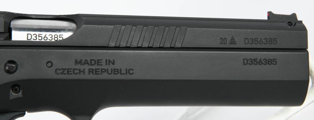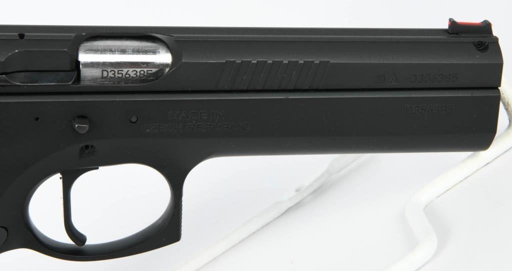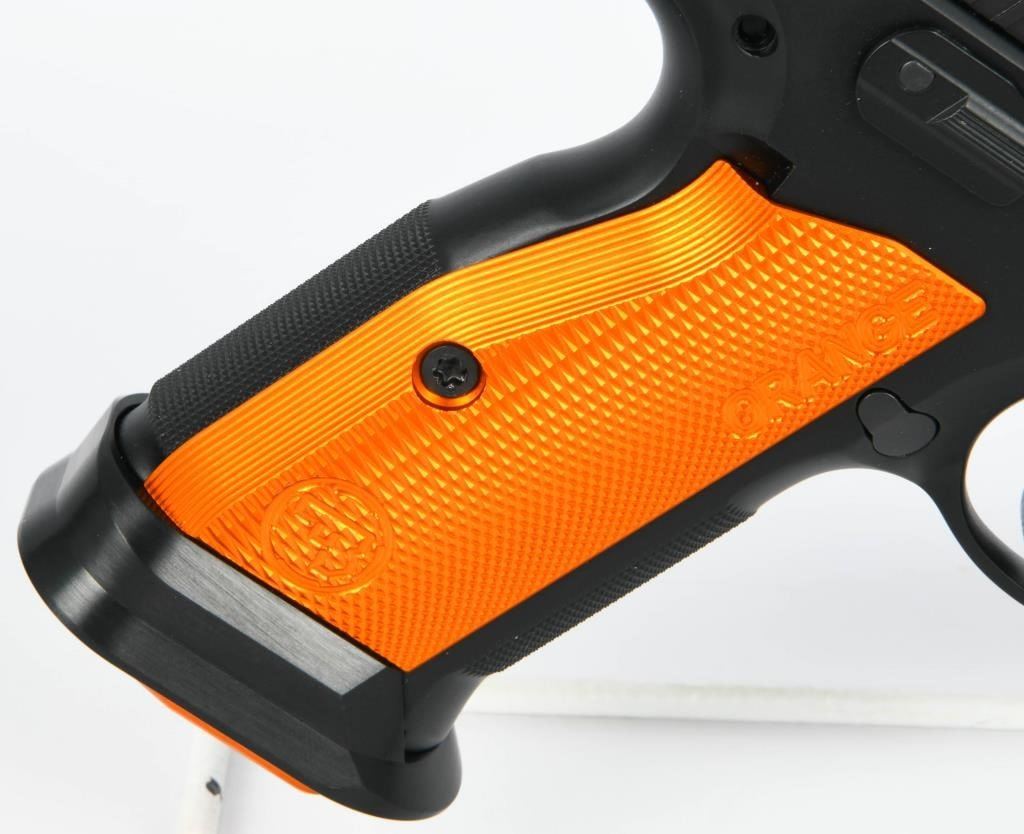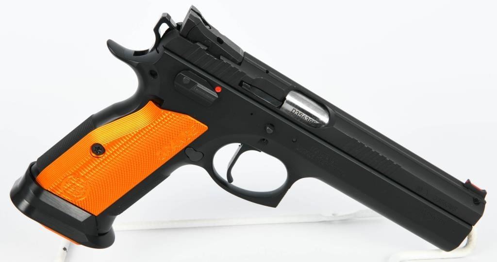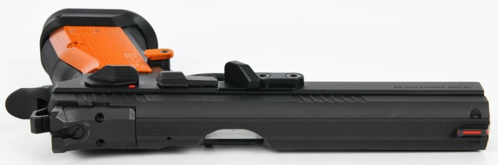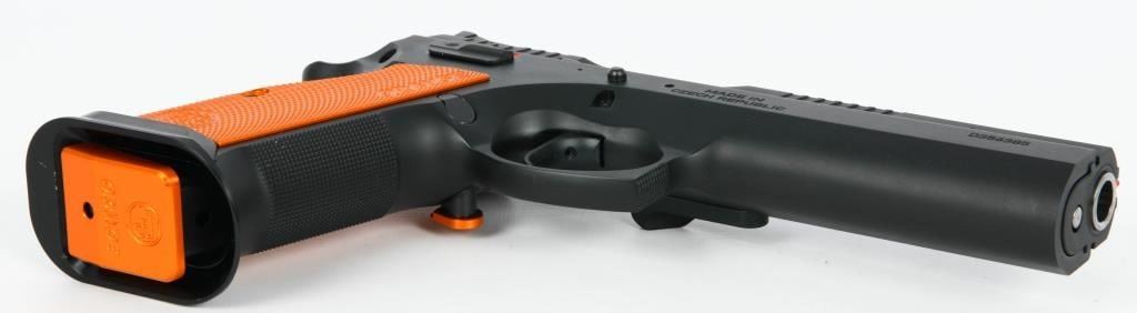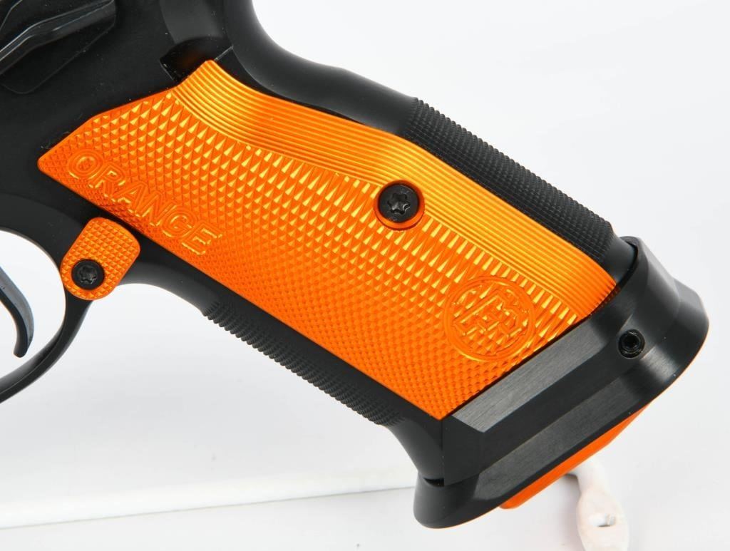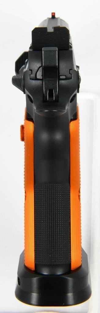 Presenting the CZ 75 Tactical Sport Orange .40 S&W Semi Auto Pistol, a pinnacle of performance designed for USPSA Limited Major competition. This brand new firearm comes equipped with a 5.23-inch barrel, providing precision and accuracy crucial for competitive shooting scenarios. The inclusion of three 16-round magazines ensures you have ample ammunition at your disposal during matches. Crafted with a steel frame, the CZ 75 Tactical Sport Orange boasts robust construction that enhances durability and stability. The aluminum orange grips not only add a touch of style but also contribute to the pistol's overall lightweight and comfortable feel. The matte black finish completes the aesthetic, making it both functional and visually appealing. The CZ 75 Tactical Sport Orange is optimized for competition with features such as a magwell, single-action-only trigger, ambidextrous safety, and adjustable target sights. Additionally, it includes a removable thumb stop, often referred to as a "gas pedal," on the left side of the frame. This pistol is designed to deliver a joyous shooting experience, with a cold hammer-forged barrel, light trigger pull, and a short reset, making it a serious contender in the world of competitive shooting. Whether you're a seasoned competitor or exploring the world of USPSA Limited Major division, the CZ 75 Tactical Sport Orange is a top-tier choice.