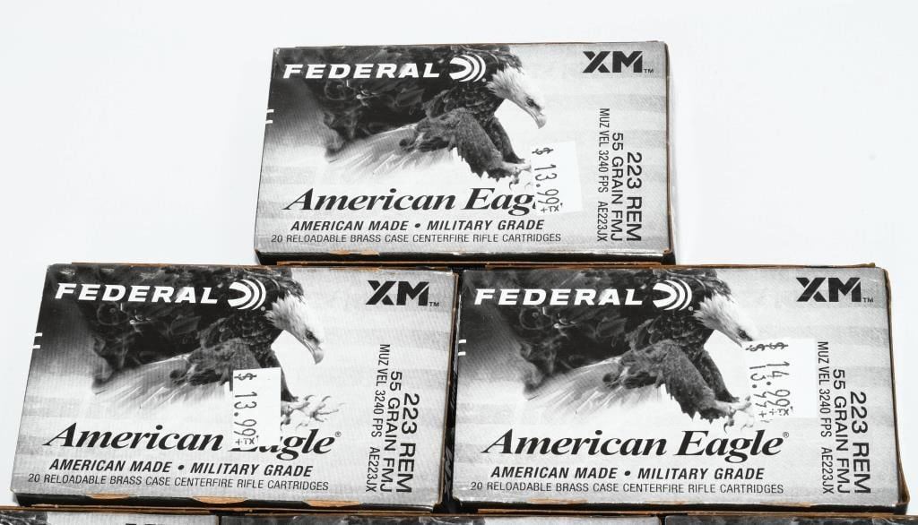 Ammo Ammunition, 55 Grain FMJBT 3240 fps These full metal jacket rounds feed reliably and shoot accurately, a great choice for the hours of target practice it takes to perfect your skills. American Eagle performance is nearly indistinguishable from the more expensive options. Federal Premium Ammunition produces the standard and then further refines it. Federal is committed to producing the top ammunition across a wide range of calibers and frequently releases new cartridge options. Federal ammo crafts each of its brands to a specific use, ensuring that shooters have the best load for the best results, whatever the occasion. Federal American Eagle .223 Rem Ammunition Specifications and Features: Manufacturers Number AE223JX .223 Remington 55 Grain Full Metal Jacket Boat Tail (FMJBT) Reloadable Brass Case Ideal for target practice Accurate and reliable Consistent primers and brass Muzzle Velocity 3240 fps Muzzle Energy 1282 ft/lbs Uses Target Practice, Plinking and General Range Time