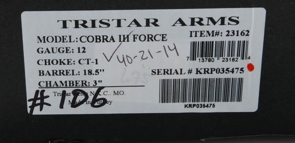 Greetings, savvy bidders! Behold the incredible TriStar Cobra III Force 12 Gauge Pump Action Shotgun, a reliable and budget-friendly choice for home defense. This shotgun boasts features typically found in top-tier models but at a fraction of the cost. This one comes to you brand new in the factory box. The Cobra III Force is equipped with an agile 18.5" combat length barrel, perfect for maneuvering in tight spaces during critical moments. What sets it apart is the spring-assisted forend, ensuring lightning-fast loading and reloading for rapid-fire situations where every second matters. With a fixed pistol grip stock, picatinny rails on the receiver and forend, a ghost ring rear sight, and a raised bridge fiber optic front sight, the Cobra III Force delivers an exceptional shooting experience. The return spring in the forearm enhances your control and comfort, allowing for almost intuitive shooting precision. This shotgun's chamber accepts both 2-3/4" and 3" shells, providing versatility in load options for various scenarios. The stock features a soft rubber recoil pad and grip, enhancing your comfort, especially with heavier loads. But that's not all! The threaded barrel accommodates the Beretta/Benelli Mobil Choke system, transforming this home defense powerhouse into an excellent turkey or hog hunting companion. Bid confidently for the TriStar Cobra III Force ? a shotgun that works hard and plays hard. Place your bids now, and may the auction force be with you! Good luck!