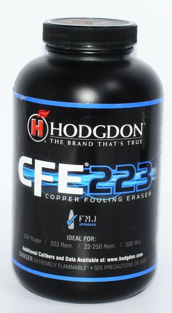 1 LB Container Of Hodgdon CFE 223 Gun Powder Introduced in January 2012, this versatile spherical rifle propellant incorporates in its formula CFE, Copper Fouling Eraser. This ingredient, originally used in military propellant, greatly deters copper fouling. It contributes to longer periods of top accuracy with less barrel cleaning time. Being a spherical powder, metering is superbly accurate. CFE 223 yields top velocities in many cartridges such as the 204 Ruger, 223 Remington/5.56mm NATO, 22-250 Remington and the 308 Winchester/7.62mm NATO, plus many, many more.