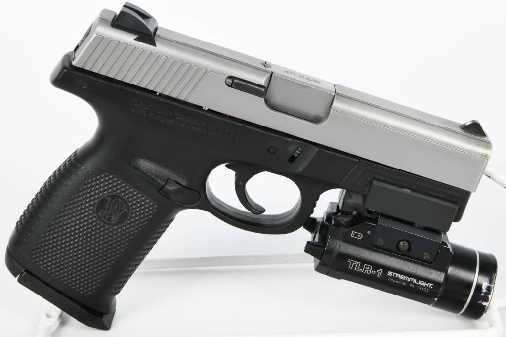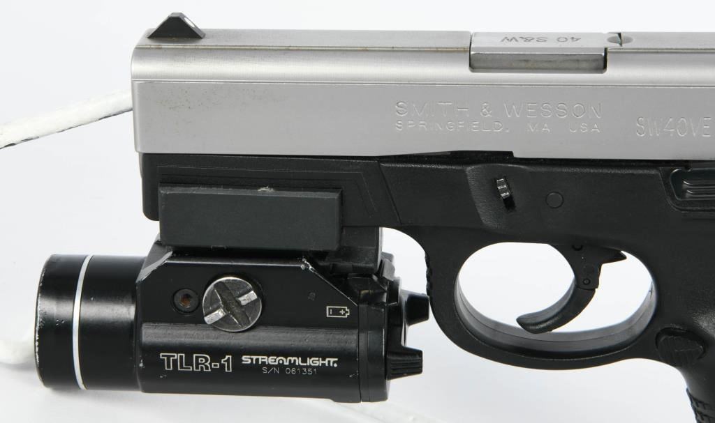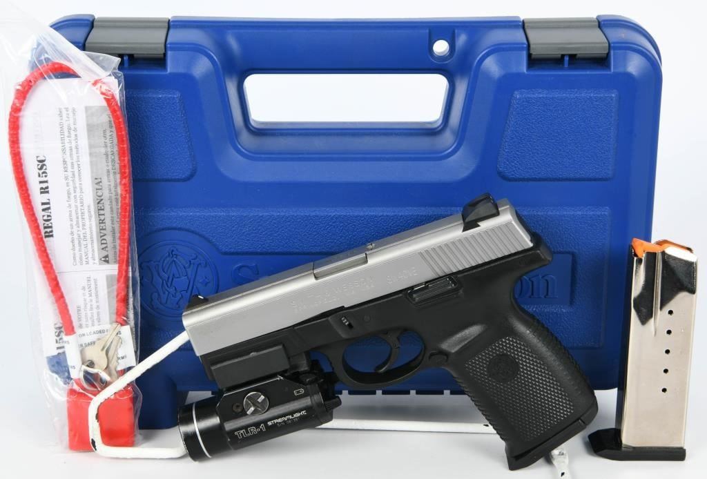Introducing the Smith & Wesson SW40VE Semi-Auto Pistol chambered in .40 S&W, equipped with a Streamlight TLR-1 Flashlight. This firearm also comes with two magazines, a lock, and is housed in a hard case. Overall, it appears to be in great preowned condition. The SW40VE combines the stopping power of the .40 S&W caliber with Smith & Wesson's reliable semi-auto design. The addition of the Streamlight TLR-1 flashlight enhances its usability, providing illumination in low-light situations, making it suitable for both self-defense and tactical applications. With the inclusion of two magazines, you have the convenience of carrying spare rounds, ensuring you're prepared for extended shooting sessions or potential self-defense scenarios. The lock adds an extra layer of safety during storage. The hard case not only protects the firearm during transportation but also helps maintain its condition over time. Whether you're a collector or someone looking for a versatile .40 S&W pistol, this Smith & Wesson SW40VE package offers a well-maintained option. Bid with confidence on this firearm, and consider it as a valuable addition to your collection or a reliable tool for various shooting needs. The combination of caliber, accessories, and overall condition makes it a compelling choice for those seeking a dependable semi-auto pistol.