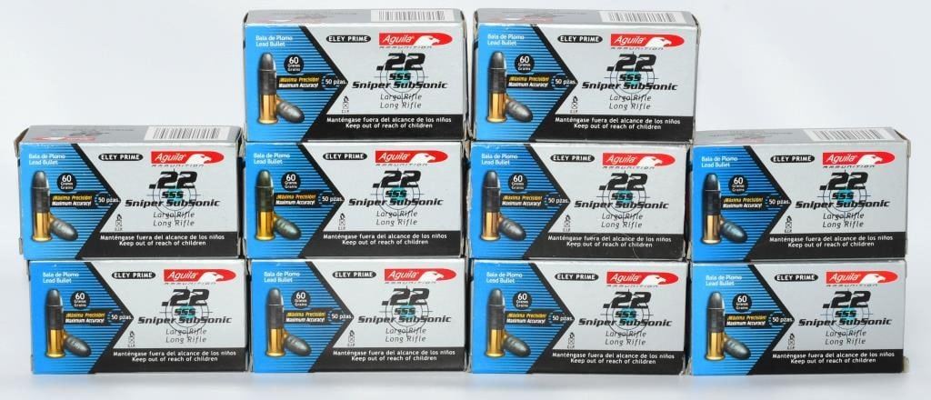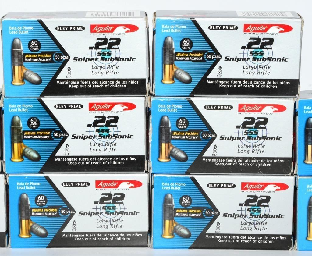 Secure 500 rounds of Aguila .22 LR Subsonic ammunition, featuring the Sniper Subsonic Eley Prime with a 60-grain projectile. Aguila is renowned for its quality and precision in the ammunition industry. Designed for subsonic performance, these rounds are ideal for suppressed firearms, offering reduced noise and maintaining accuracy. The 60-grain construction ensures reliable cycling in your .22 LR firearms, making them suitable for various shooting applications, including target shooting and plinking. Bid confidently on this opportunity to acquire 500 rounds of Aguila .22 LR Subsonic ammunition, elevating your shooting experience with high-quality, subsonic rounds. Note: Please ensure compliance with local and state regulations regarding the purchase and possession of ammunition.