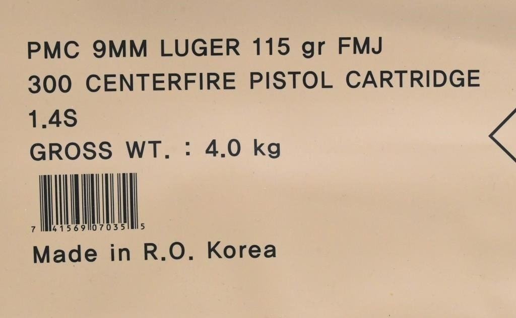 300 Round Battle Pack Of PMC 9mm Luger Ammunition, Sealed Un-Opened , 115 Grain Full Metal Jacket, The Bronze family of PMC Ammunition offers reliable performance at an affordable price. This PMC Bronze 9mm ammunition has a lead core enclosed by a strong metal jacket to make a non-expanding, deep penetrating bullet. The 9mm cartridge provides smooth, reliable feeding in all types of 9mm Luger handguns. Proving reliable performance shot after shot, PMC Bronze bridges the gap between range ammo costs and premium ammo precision! This Battle Pack provides you with bulk ammo that can also be stored as is till range day. Taking pride in the large number of types and zero-defect performance of its ammunition, Poongsan Corporation (also know as Precision-Made Cartridges or PMC) uses carefully selected high quality raw materials and ensures the high performance of sporting ammunition by carrying out stringent quality inspections and target tests. PMC Bronze 9mm Luger Battle Pack Ammunition Features and Specifications: Manufacturer Number 9A-BP 9mm Luger 115 Grain Full Metal Jacket Projectile Reloadable Brass Case Muzzle Velocity 1150 fps Muzzle Energy 338 ft/lbs Uses Target, Practice, Plinking 300 Round Battle Pack