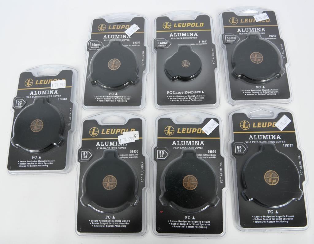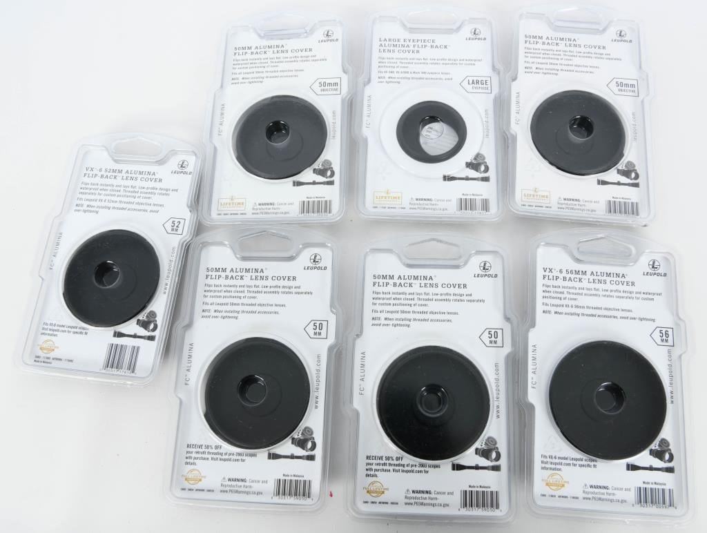 Optics Enthusiasts, get ready for a fantastic opportunity! We present 7 new-in-package Leupold Alumina Flip Back Lens Covers. This versatile collection includes covers that fit various sizes, including 56mm, 50mm, large eyepieces, 52mm, and more. Seize this chance to protect and enhance the longevity of your valuable optics with top-notch Leupold Alumina Flip Back Lens Covers. Bid now and ensure your optics are always ready for peak performance! Happy bidding!
