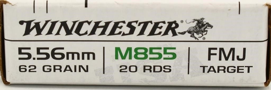100 Rounds Of Winchester 5.56 Nato M855 Ammo Winchester 5.56 NATO M855 Ammunition 62 Grains SS109 FMJ Green Tip 3060 fps 20 Rounds per Box Winchester SS109 Green Tip Penetrator Loaded by Winchester using Lake City Brass and packed in the Winchester white box, this M855, SS109 ammunition features a 62 grain full metal jacket bullet with a lead alloy and steel core. These green tip rounds are designed for use with the AR platform. This is the same ammo Winchester has been manufacturing for issue to the American Military for many years, and the reliability of Winchester M855 is legendary. If you need Legendary reliability, look no further than Lake City Winchester M855 5.56 NATO Green tip 20 Rounds per Box Features and Specifications: Caliber:5.56 NATO Bullet Type: Full Metal Jacket Bullet Weight: 62 Grain Lake CIty Stamped SS109 Green Tip Penetrator Muzzle velocity: 3060 fps Muzzle energy: 1288 ft/lbs Uses: Target, Training, Plinking or as back up for your primary defensive loads. At close-range velocities, these bullets tend to fracture at the cannelure into two or three main pieces.