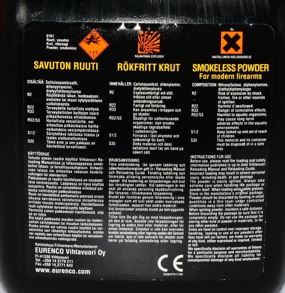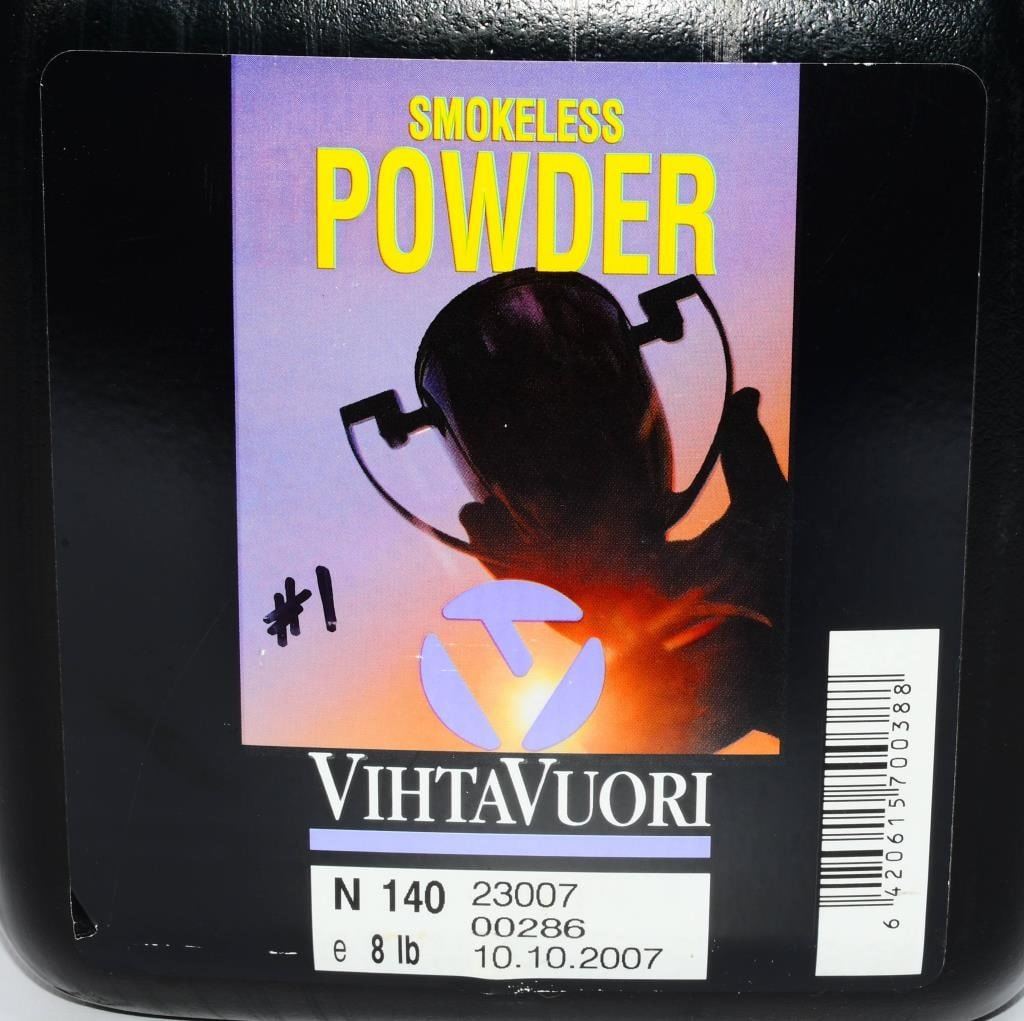 8 Lb Container Of Vihtavuori N140 Gun Powder N140 is a tubular powder type with grain dimensions of 1,0 mm length and 0,9 mm diameter. The structure, grain geometry and graphite coating makes it work excellent in all reloading machines and dosing is super easy. The N140 powder burns at a medium speed on our scale of rifle powders, making it a versatile handloading powder for both small game hunting and sport shooting applications. N140 is not the choice if you try to reach highest muzzle velocity possible, but it is certainly the choice if you try to get best possible accuracy. This powder is a true multipurpose powder, which can be used for a large range of calibers from .223 Remington to .308 Winchester, 30-06 Springfield and .375 H&H Magnum