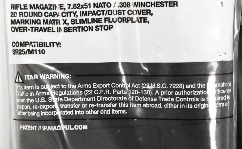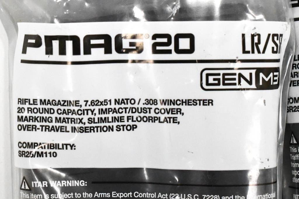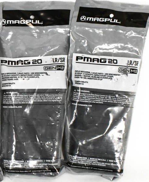 2 NIP Magpul PMAG 20 DPMS LR308/SR-25 Magazine, 20 Rounds, Gen M3, Black Magpul PMAG Gen 3 magazines are designed for the DPMS LR308/SR-25 pattern AR rifles chambered in .308 Winchester. These magazines have quickly become the industry standard due to their extreme durability, reliability, and cost effectiveness. The Gen 3 magazines feature the new constant curve geometric body, anti-tilt follower and other minor improvements. The polymer magazine reduces overall magazine weight by half without sacrificing durability. Magpul LR/SR magazines are a must-have if you own a compatible .308 AR type rifles. Know Your State Laws Before Bidding On High Capacity Magazines